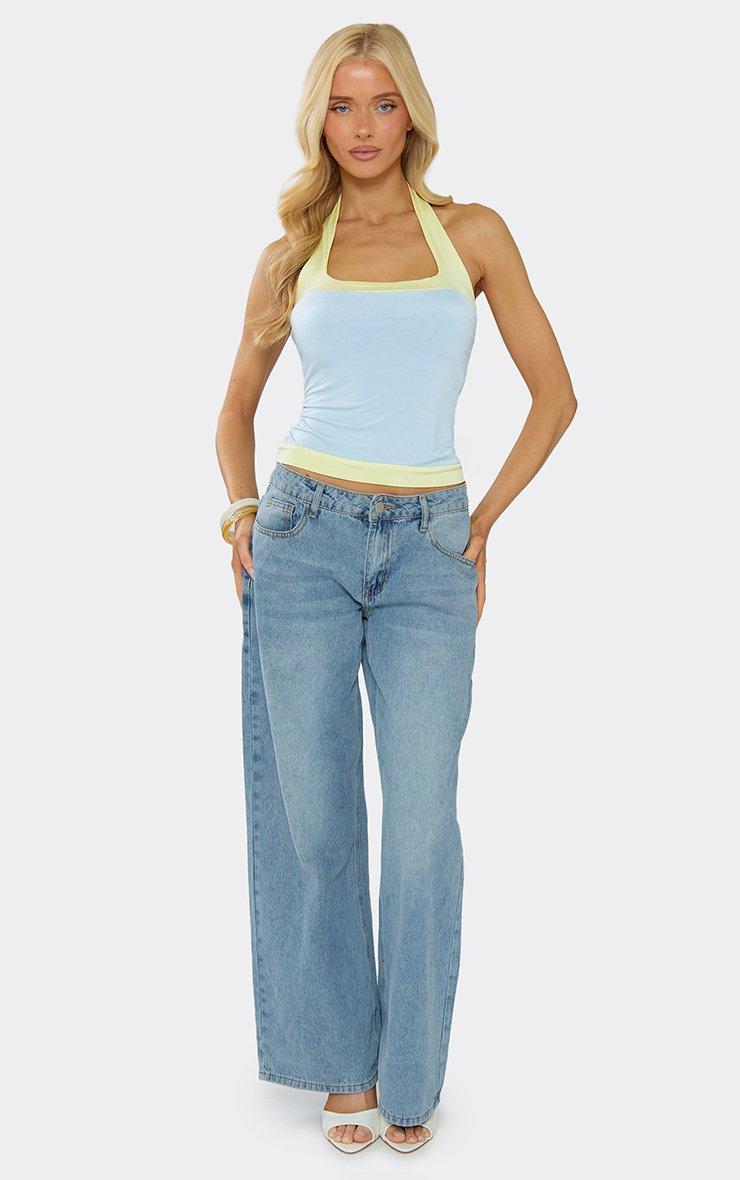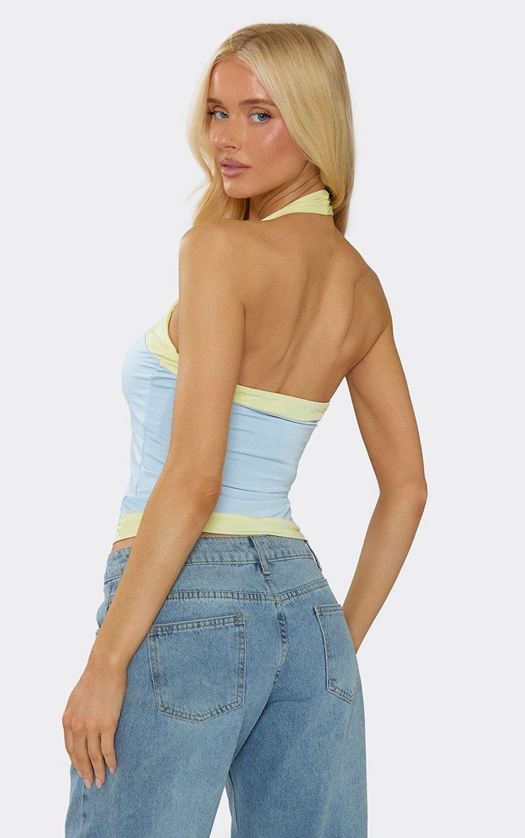 Make a statement at your next summer event in blue material featuring a halterneck and contrast detailing. This sharp, high-octane top delivers a total Y2K-inspired silhouette for a major it-girl finish. Style with a white mini skirt and silver jewelry for a polished vibe.