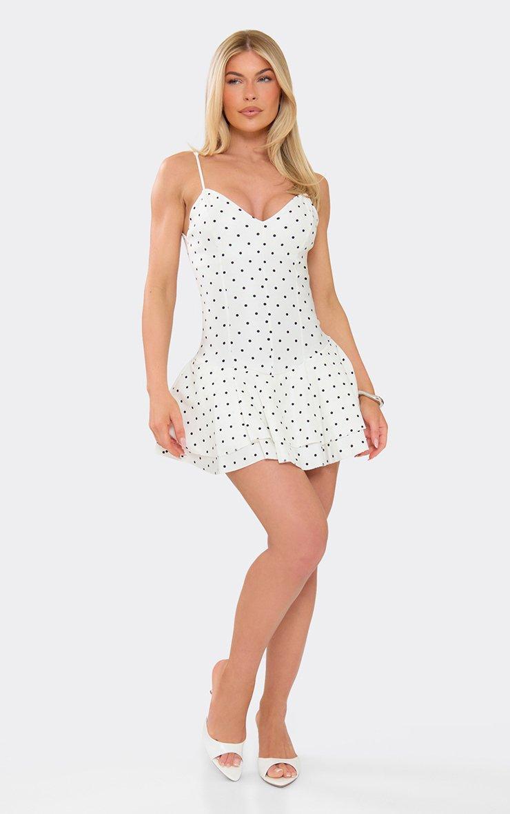 Get holiday ready in this polka dot must-have. Featuring white polka dot material with frilled hem and plunge neck detailing. This playsuit is a total mood for your next getaway. Style with chunky sandals and a straw bag for a flawless finish.