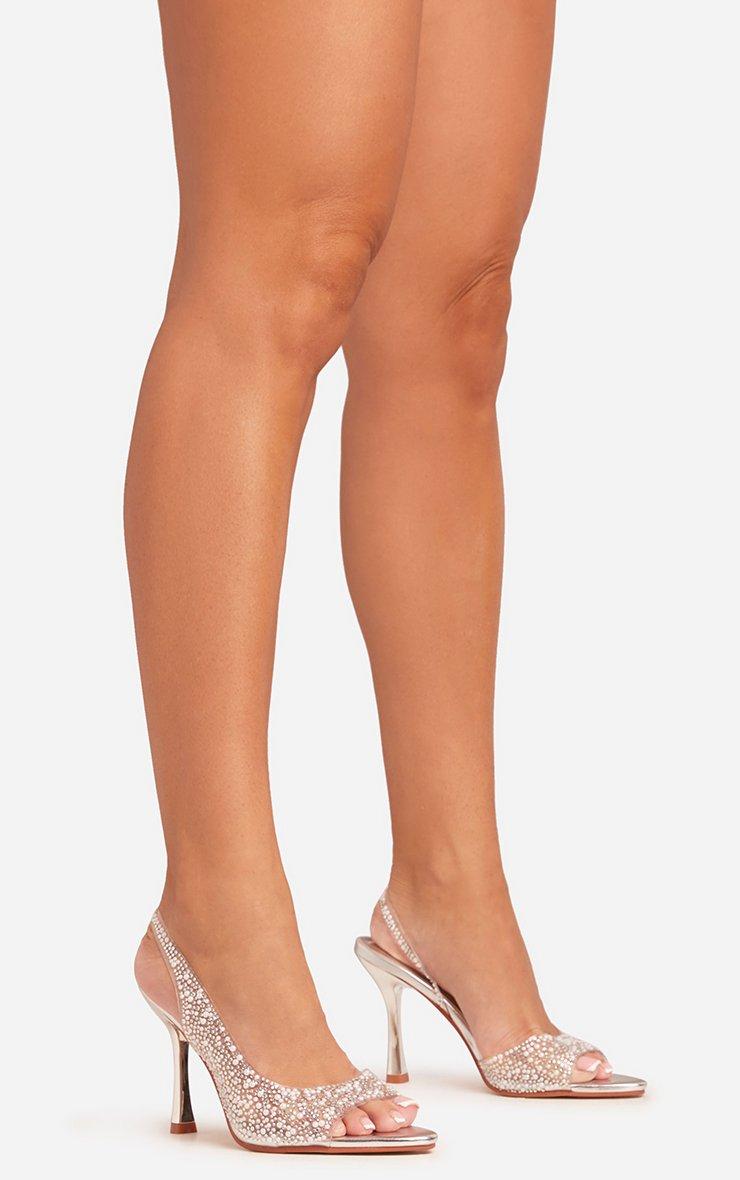 Ready to stand out on date night, doll? Featuring silver faux leather material with stunning diamante detailing, these peep toe slingback heels are perfect for adding glam to any outfit.