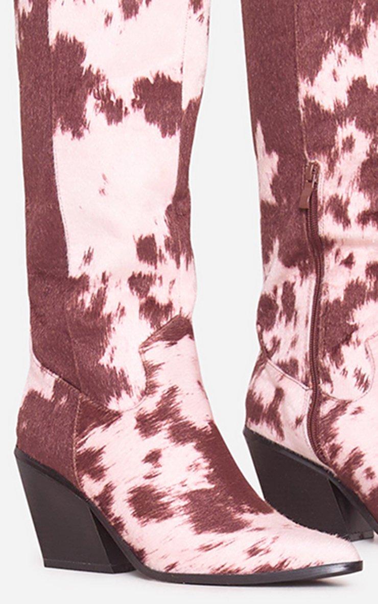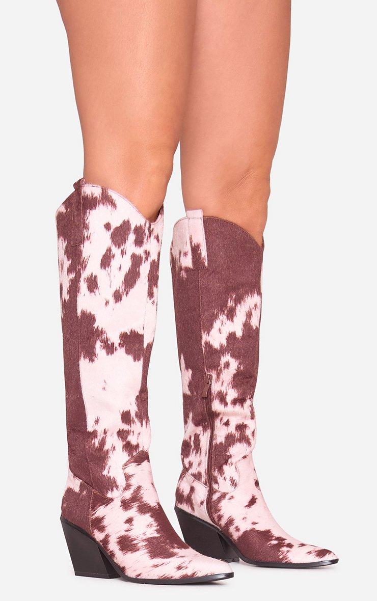 Ready to turn heads, doll? Featuring brown cow print faux fur with a pointed toe, these Western cowboy boots are all about making a fierce statement with bold, untamed style. Time to step into the spotlight.