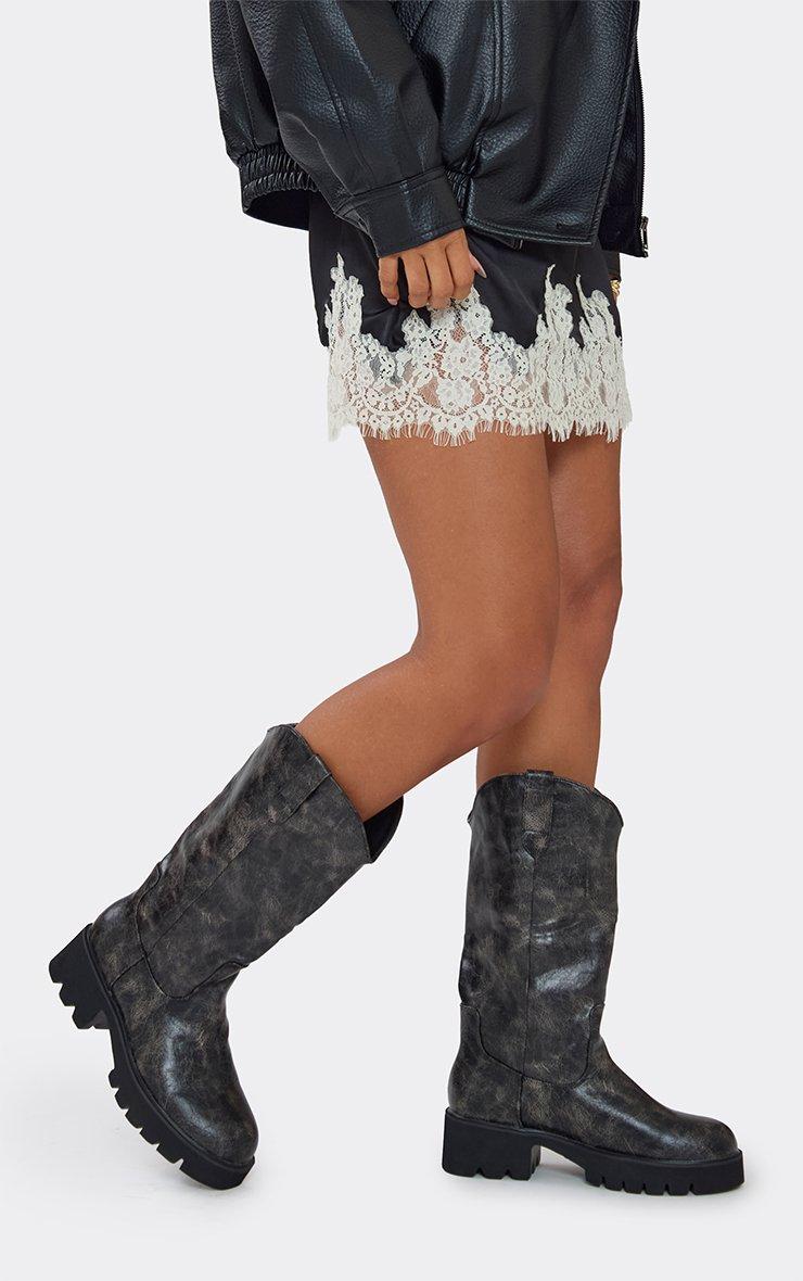 Seriously Chunky Sole Mid Calf Western Biker Boot In Distressed Black Faux Leather