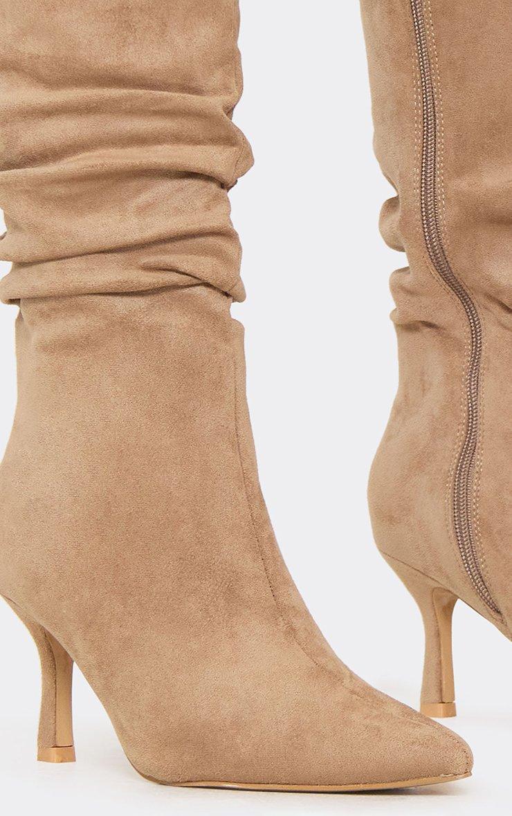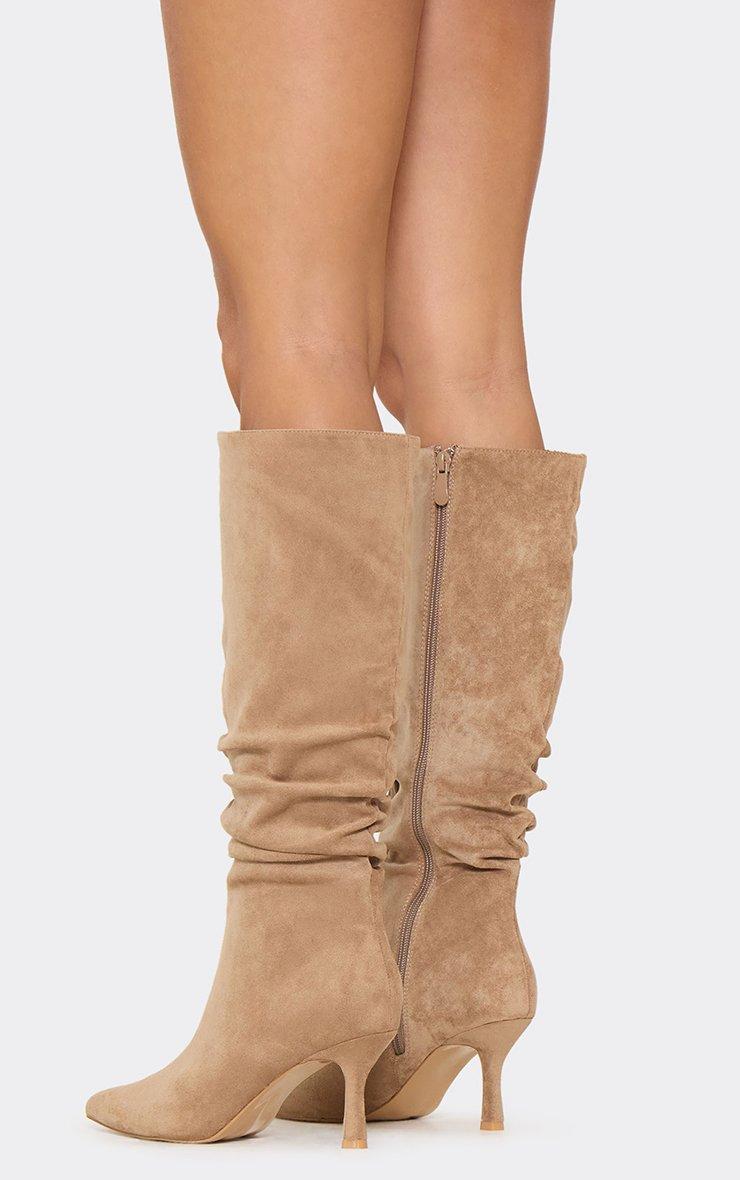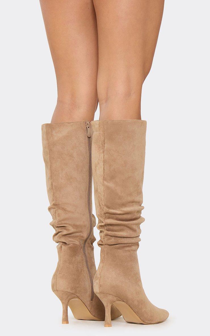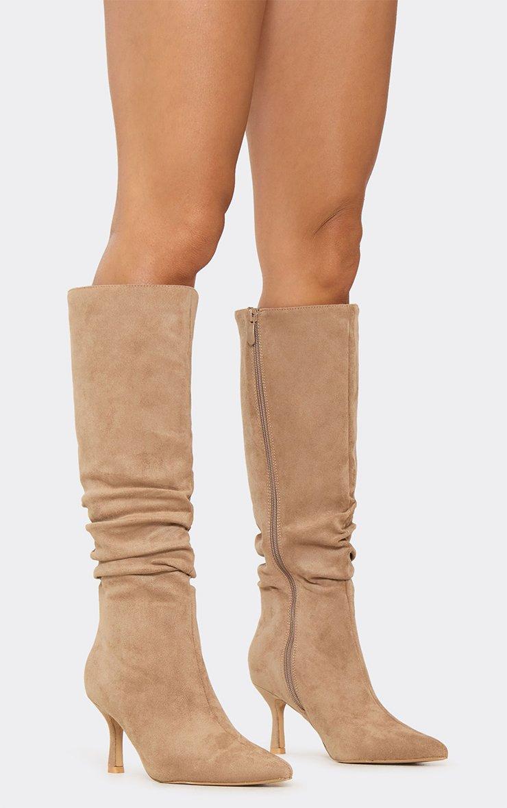 Hellie Pointed Toe Knee High Slouched Heeled Boot In Taupe Faux Suede