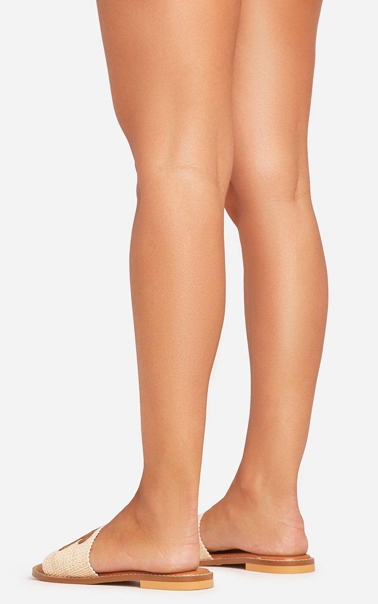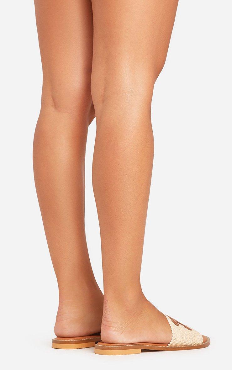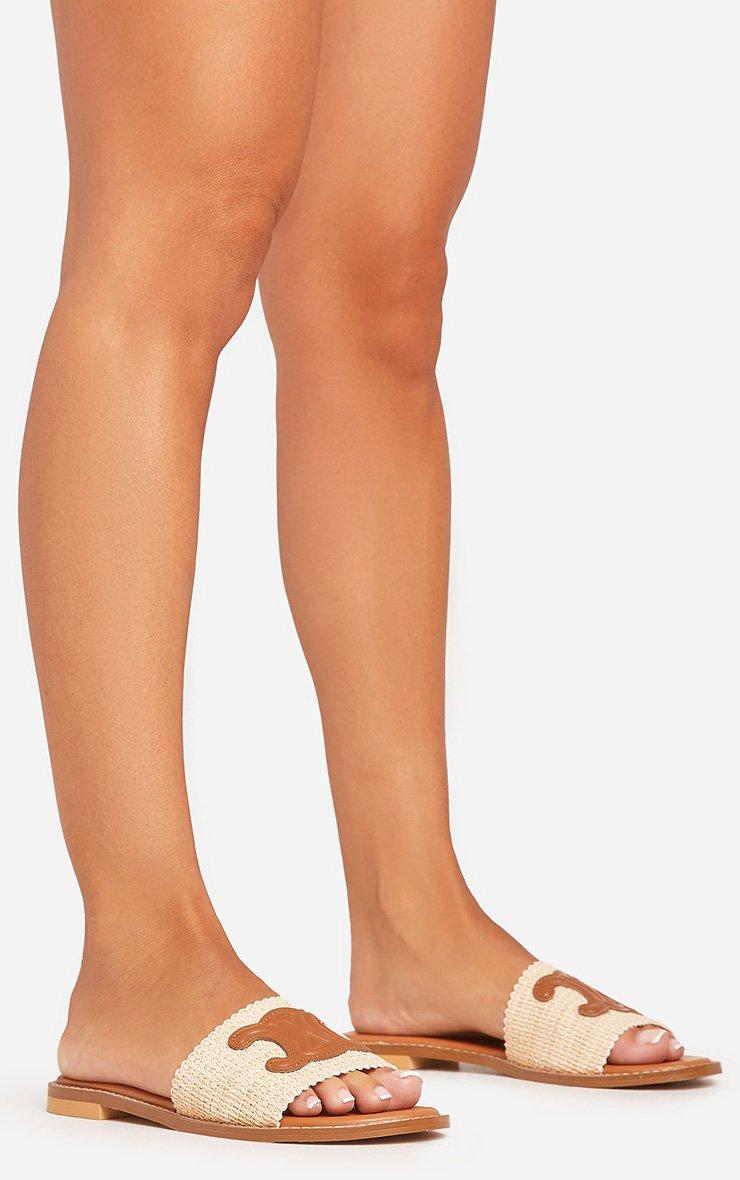Allie Logo Detail Flat Slider Sandal In Beige Woven And Tan Brown Faux Leather