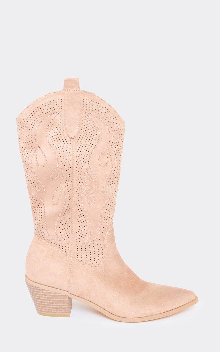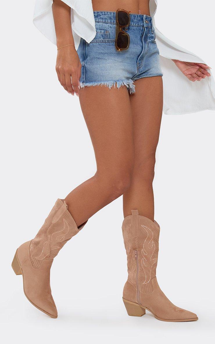 These boots will have everyone looking twice doll. Featuring a taupe faux suede material, a diamante embroidered detail, a pointed toe, a mid calf length and a western cowboy boot design.