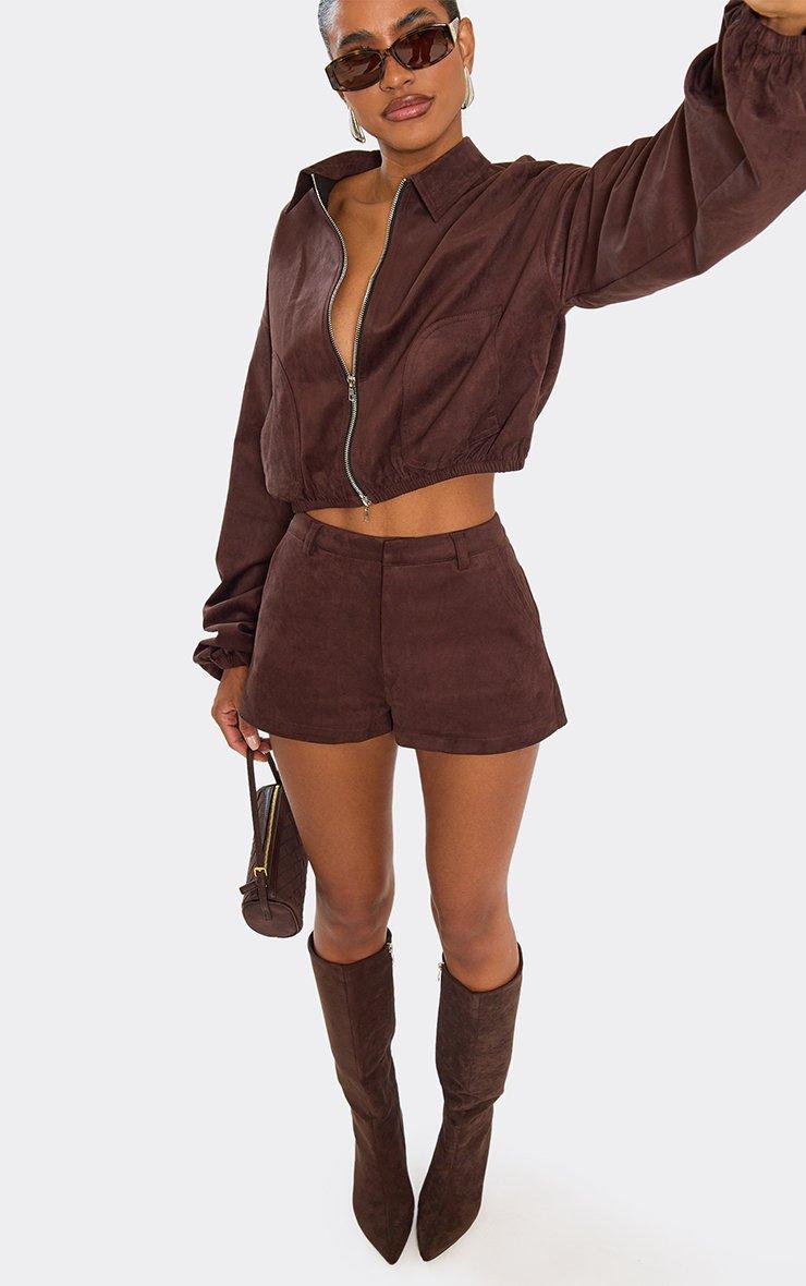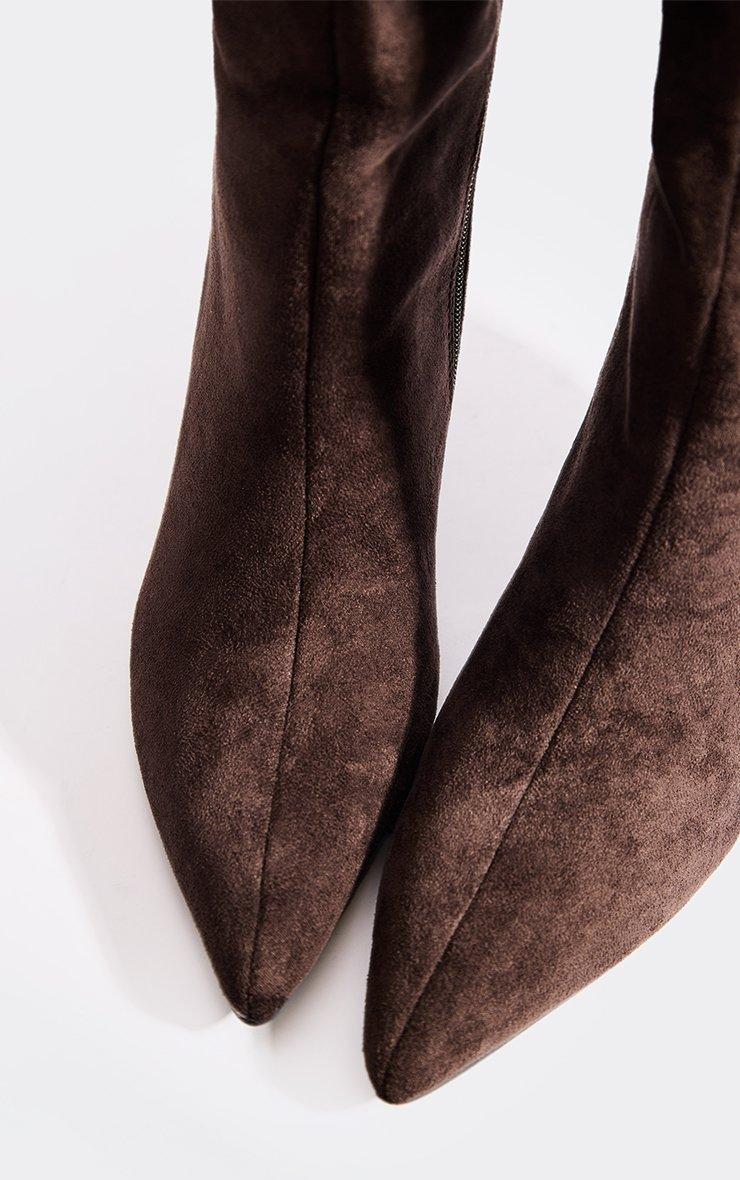 Nightly Pointed Toe Knee High Kitten Heel Boot In Brown Faux Suede