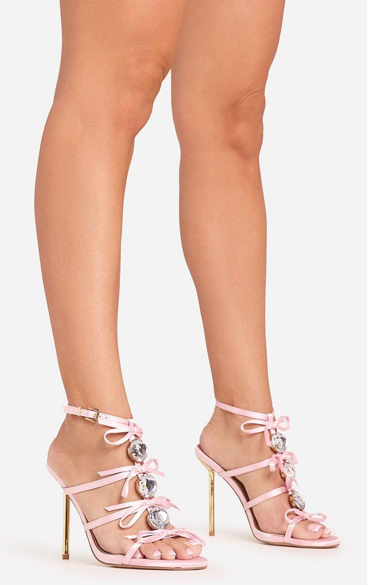 Orianna Gem Bow Detail Multi Strap Metallic Stiletto Heel In Pink Satin