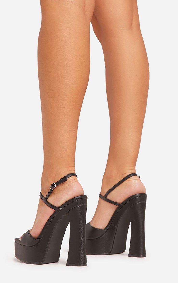 Be daring with these heels doll. Featuring a black faux leather material, a slingback strap, a square peep toe and a platform block heel.