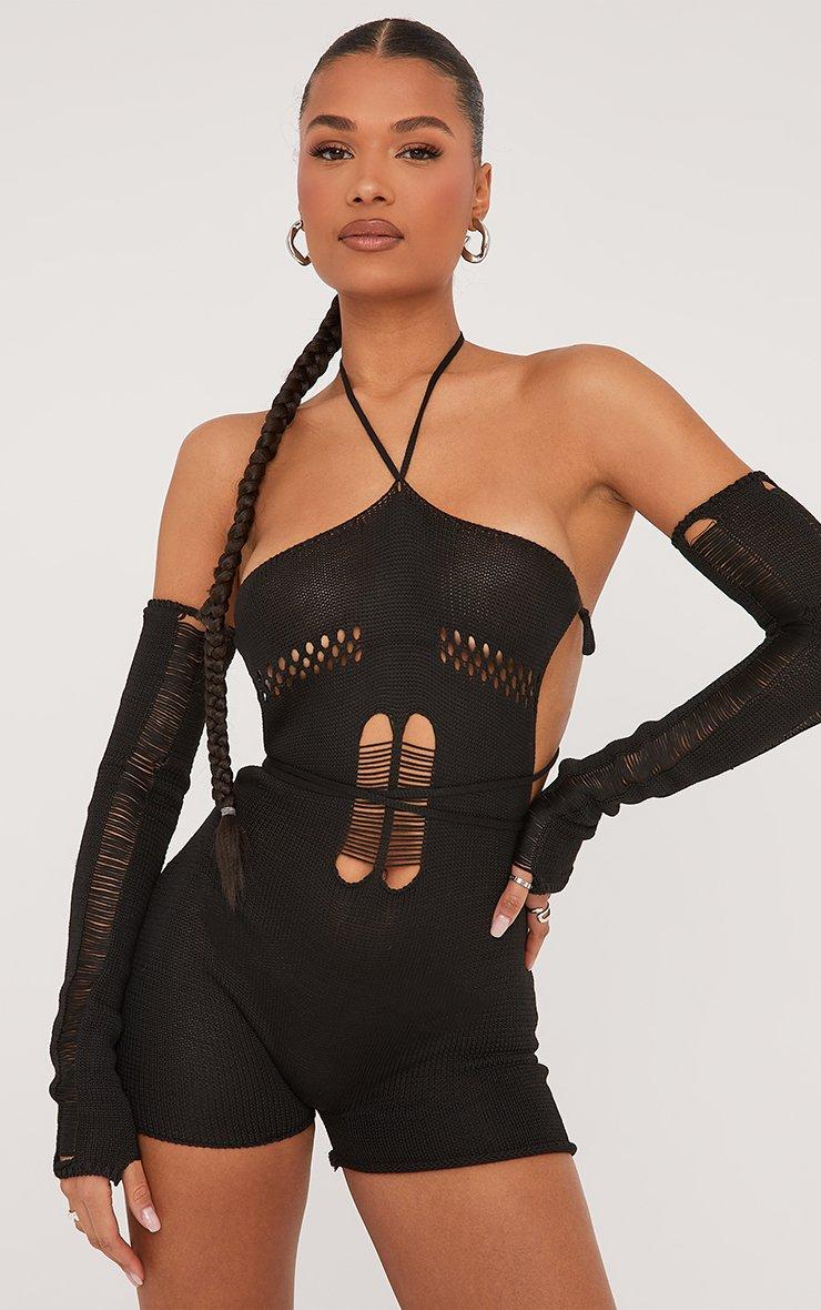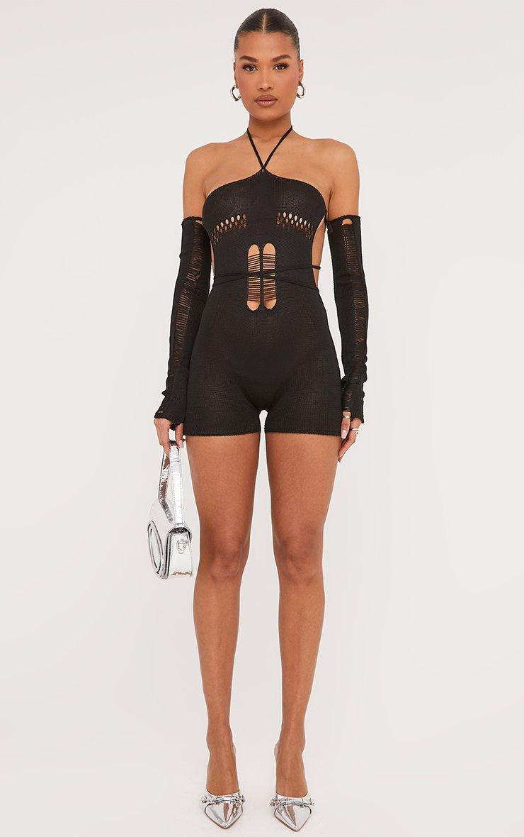 Grunge up your weekend attire with this playsuit. Featuring a black knit material, a halterneck, ladder detailing and detachable sleeves.