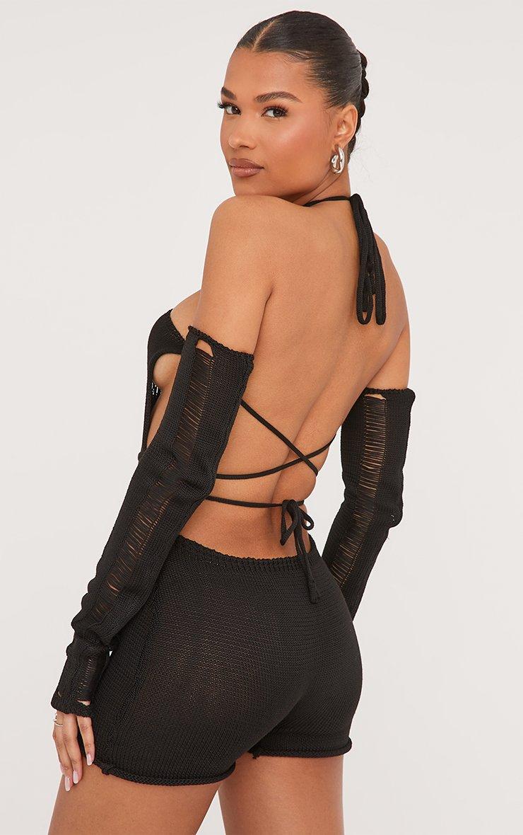 Halterneck Ladder Detail Open Back Playsuit With Detachable Sleeves In Black Knit