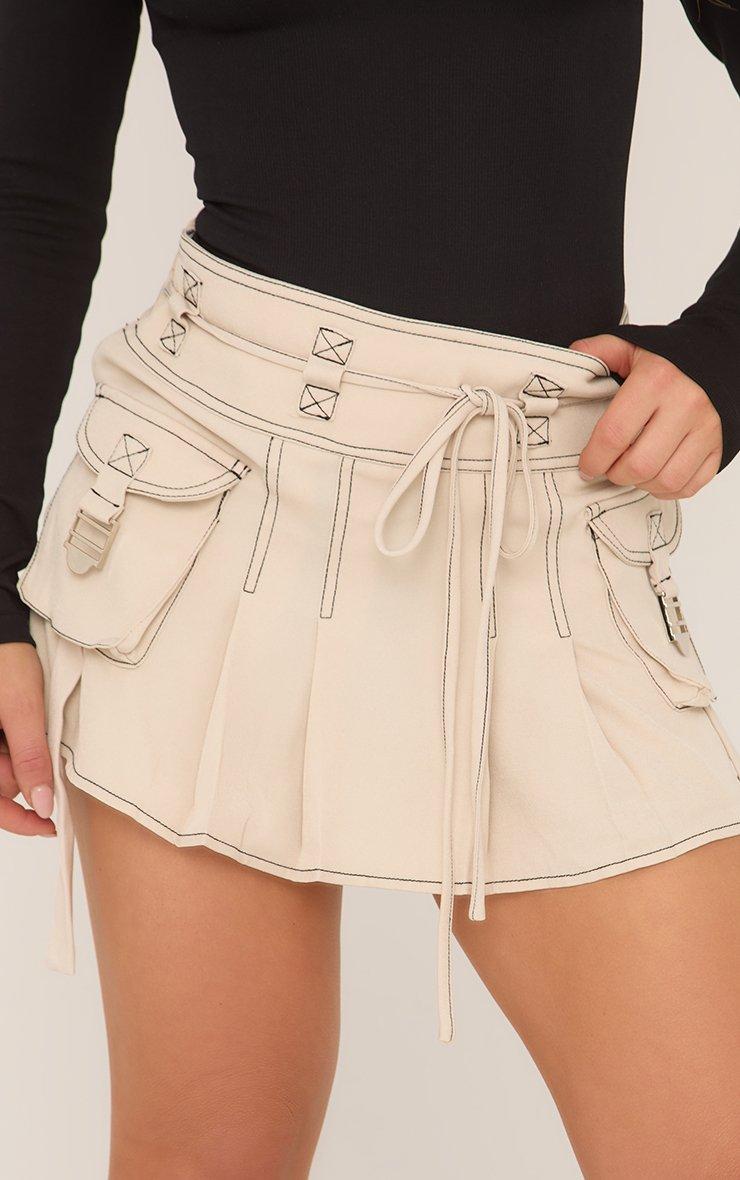 Contrast Stitch Pleated Cargo Mini Skirt In Stone Woven
