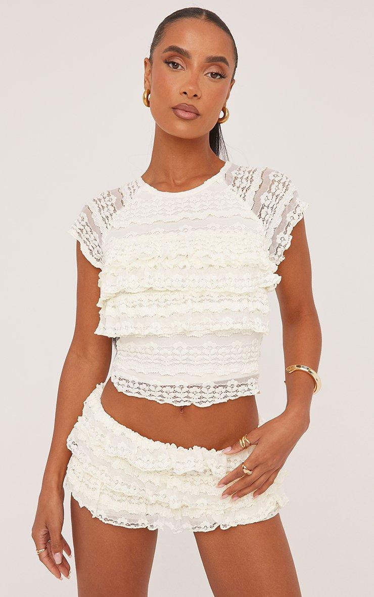 Embrace your inner fashionista with our Short Sleeve All Over Frill Detail T-Shirt In Cream Texture! This cream frill t-shirt is pure magic, showcasing dreamy frill details, short sleeves, and a cropped fit that’s both feminine and on-trend. The creamy texture adds a boho chic vibe, making it perfect for pairing with the matching lace shorts and cowboy boots for an epic festival co-ord. We can’t wait to see you rock this look!