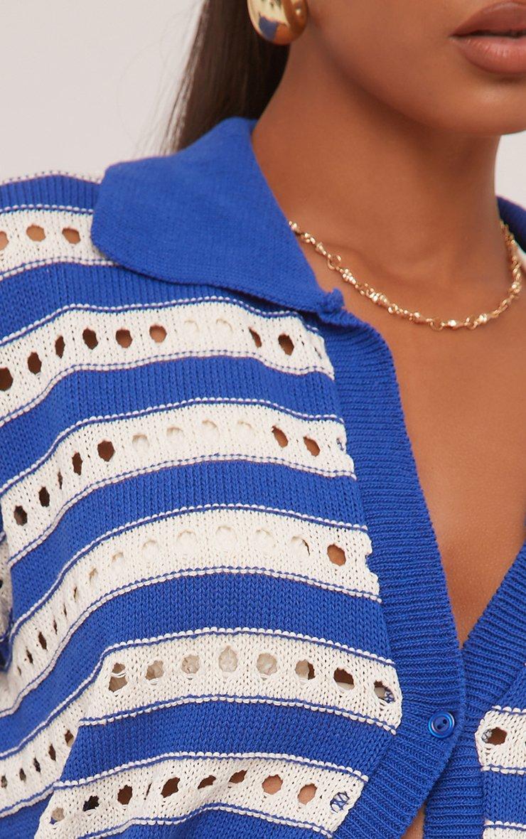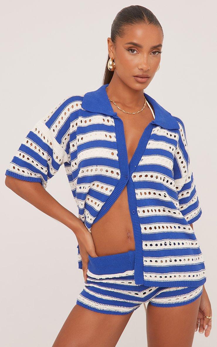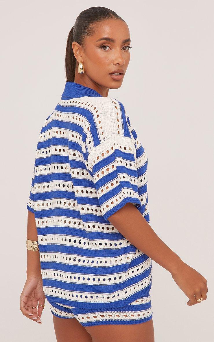 This shirt is the shirt for the summer. Featuring a crochet knit material, blue and white stripes and short sleeves.