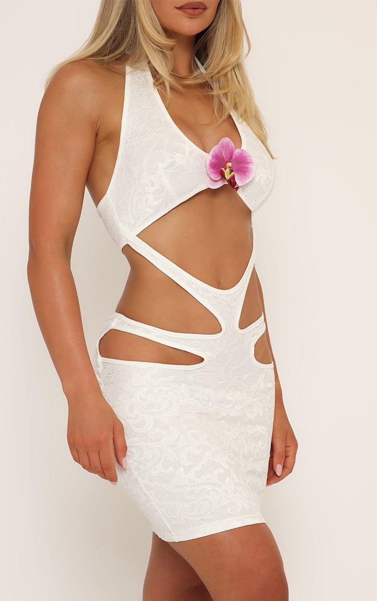 Halterneck Flower Applique Detail Cut Out Mini Dress In White