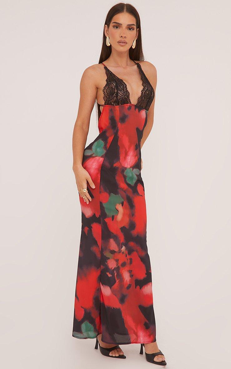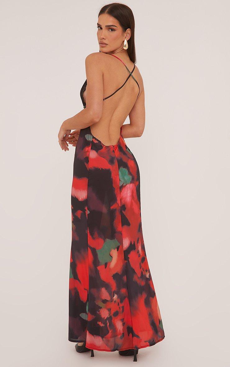 Lace Detail Floral Print Open Back Maxi Dress In Black And Red Woven