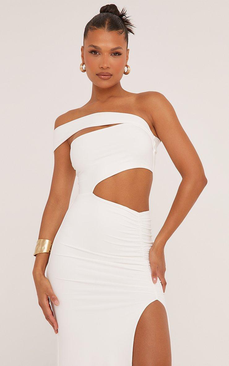 Asymmetric Bradot Cut Out Side Split Maxi Dress In White Slinky