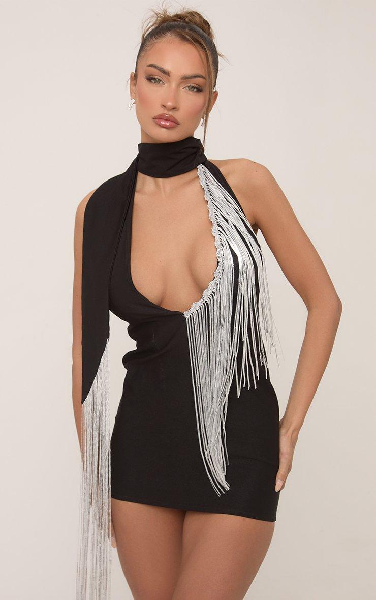 Steal all the stares in our Plunge Diamante Fringe Detail Mini Dress With Scarf Detail In Black. This black diamante fringe dress is pure drama with its plunge neckline, open back and chic scarf detail. The sparkle, the movement—this mini dress is perfect for a night out when you want all eyes on you.