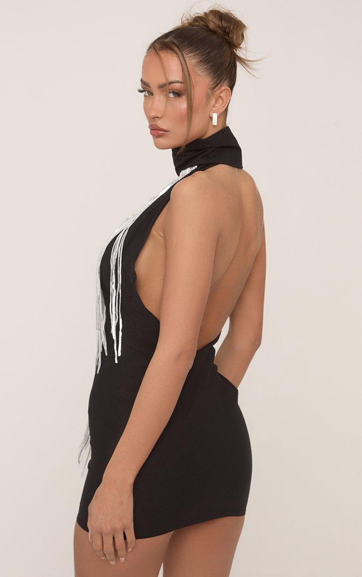 Plunge Diamante Fringe Detail Mini Dress With Scarf Detail In Black