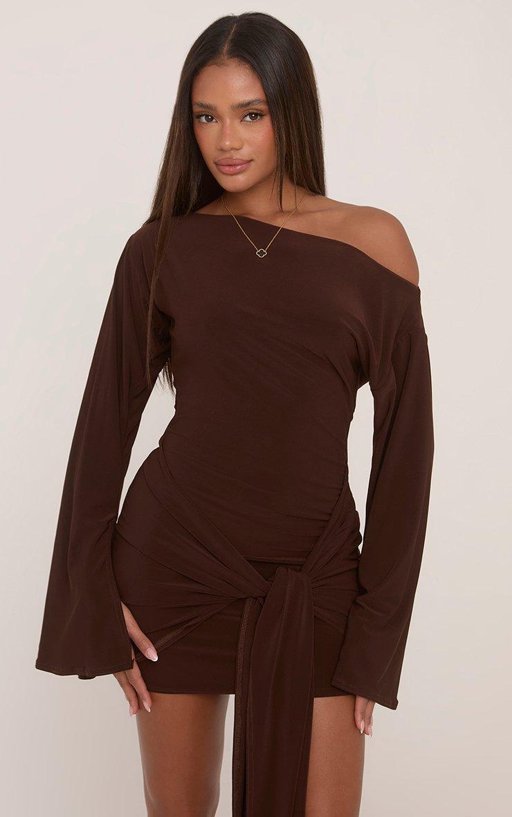 Long Flared Sleeve Drape Detail Mini Bodycon Dress In Chocolate Brown Slinky