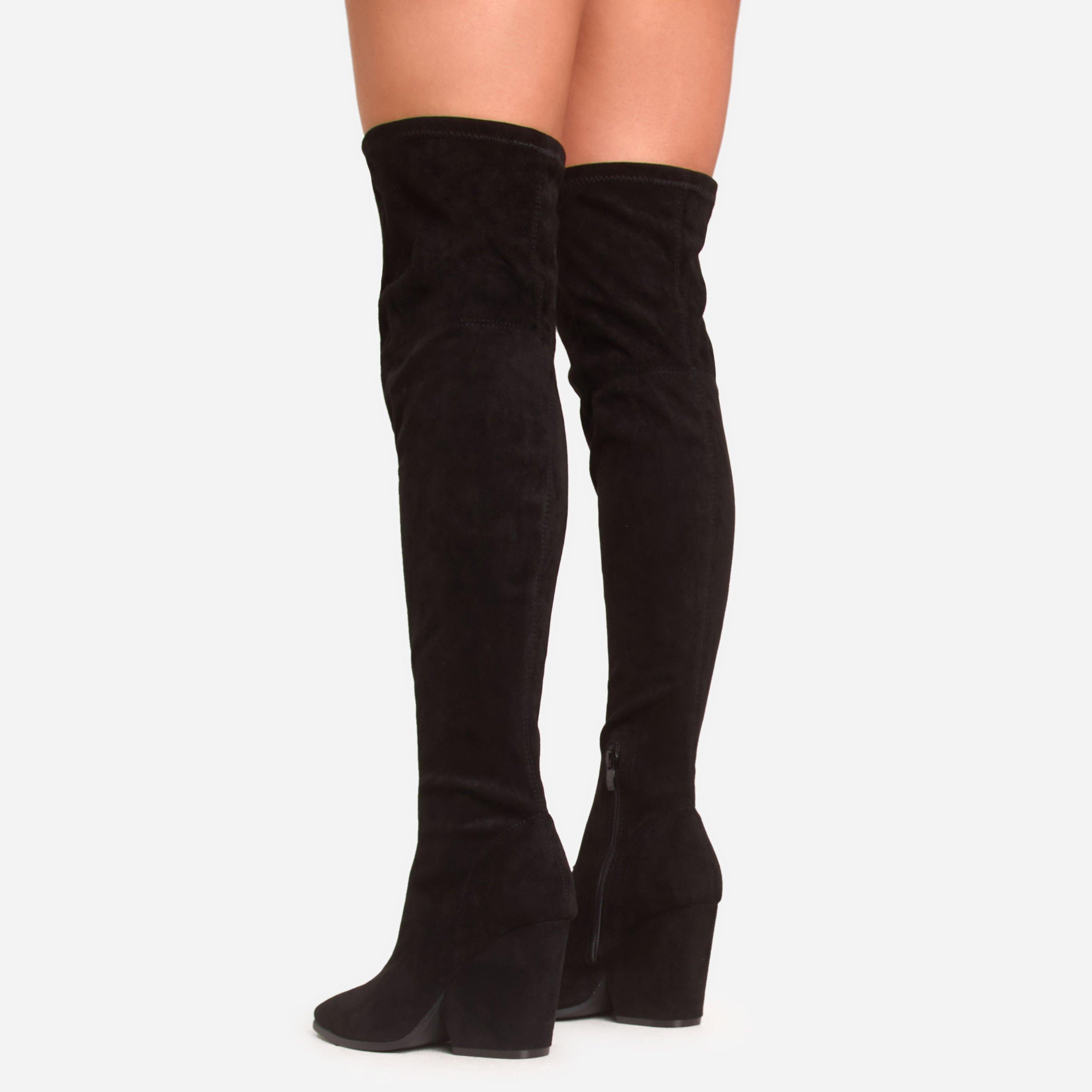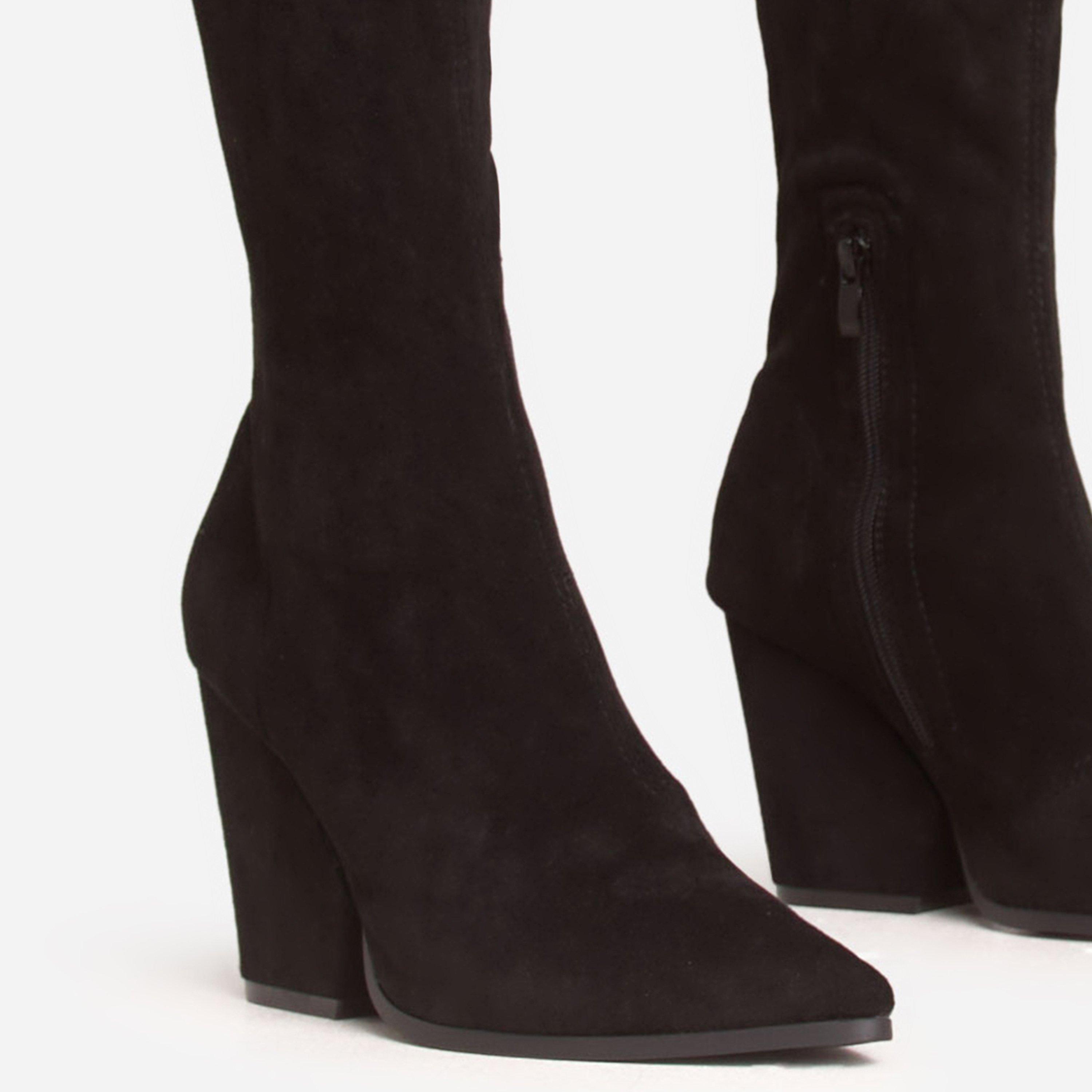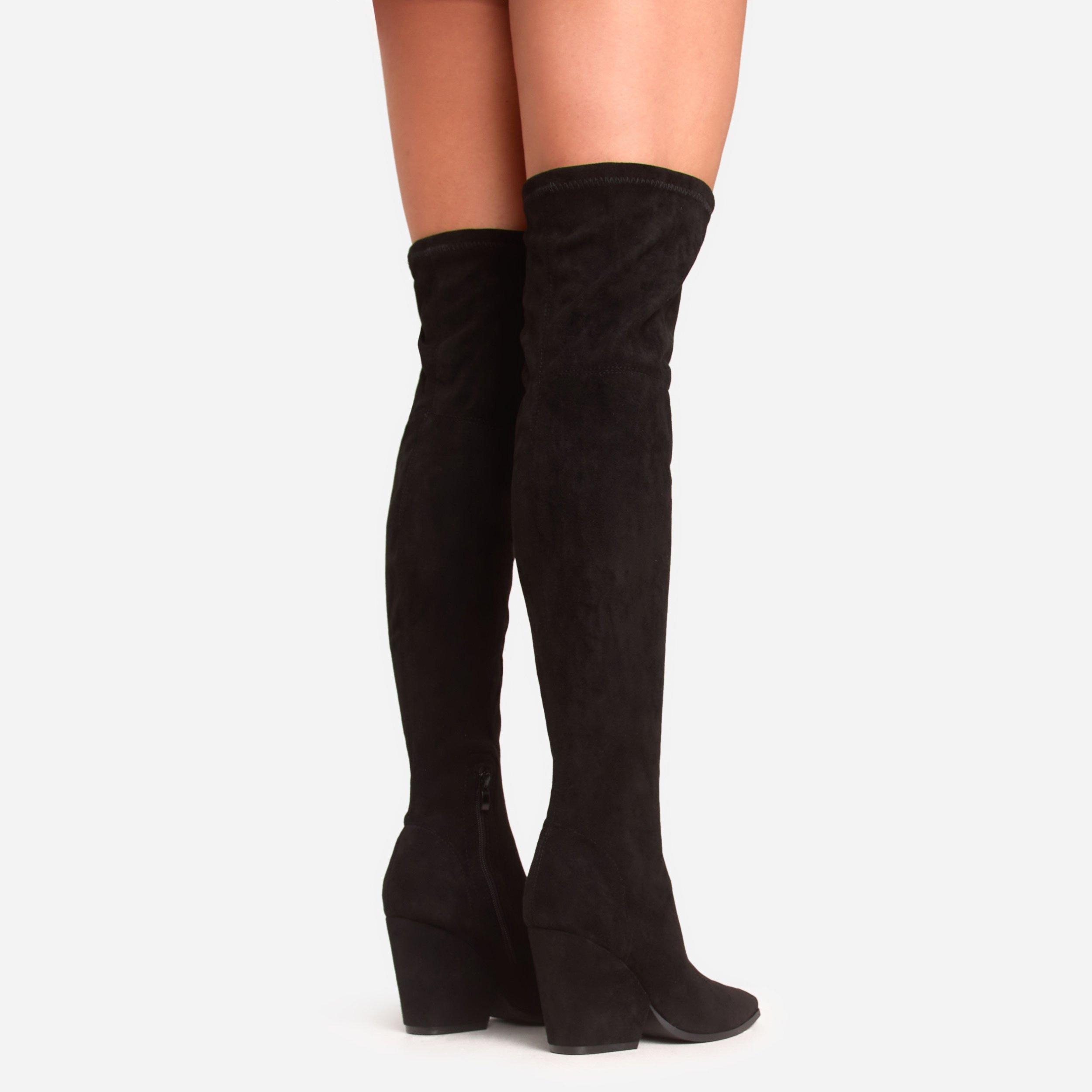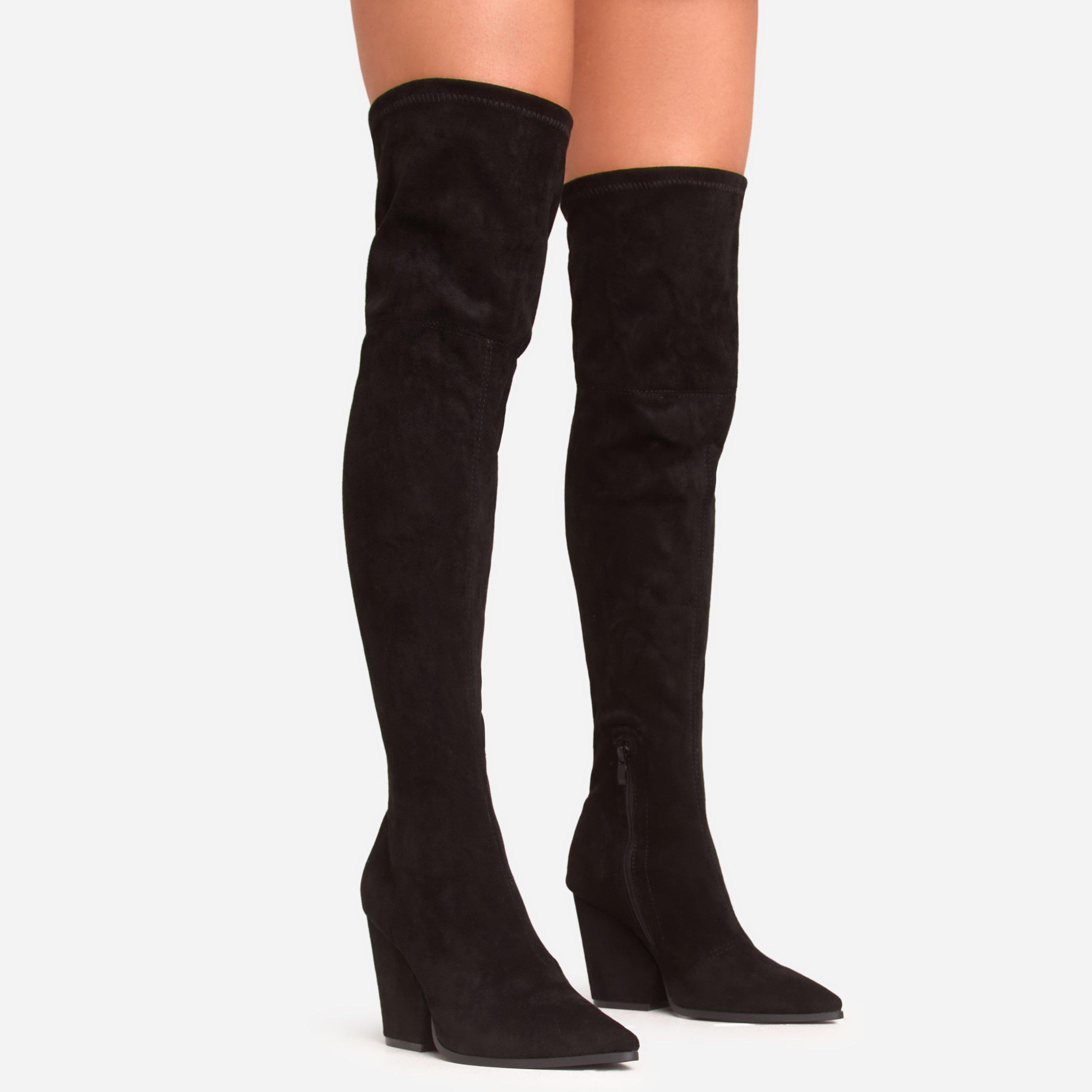 Macklin Pointed Toe Block Heel Over The Knee Thigh High Boot In Black Faux Suede