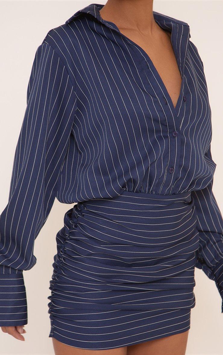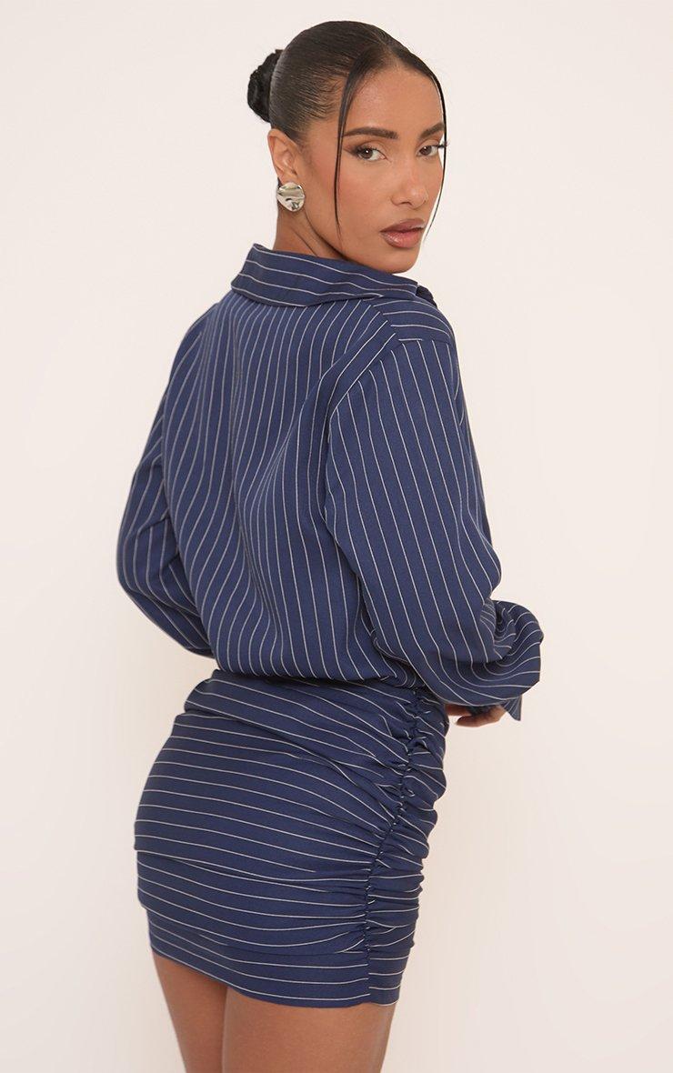 Turn up the chic factor, doll! This blue pinstripe mini shirt dress features long sleeves and ruched detailing, blending smart and sleek with a bold edge. Perfect for making a statement while keeping it classy!