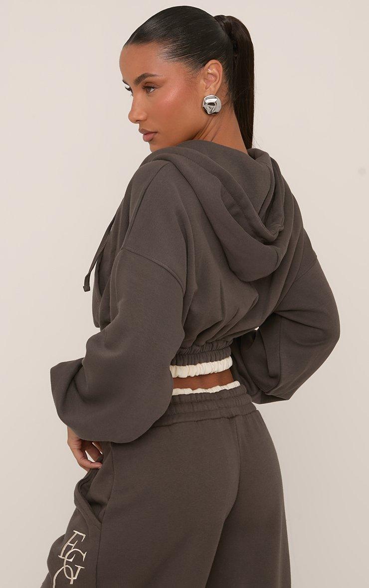 Stay cute and comfy in our Ego Graphic Contrast Hem Cropped Hoodie In Grey. This cropped grey zip up hoodie boasts a luxe ego graphic and edgy contrast hem. Style this cropped hoodie with the matching joggers for a laid-back look!