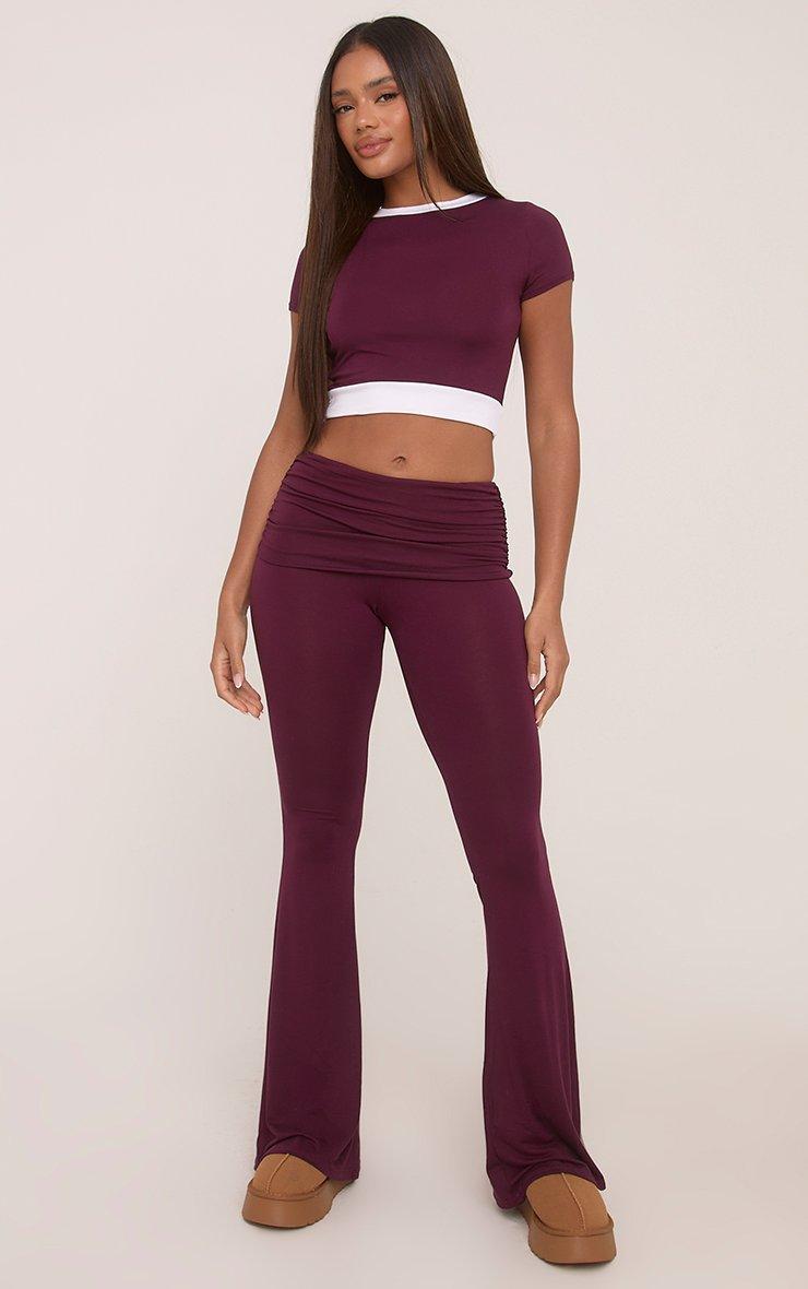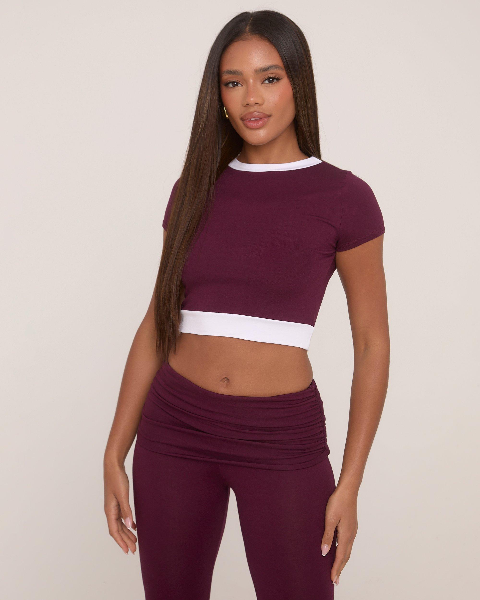 Level up chill days with our Short Sleeve Double Layer Contrast Fitted Cropped T-Shirt In Burgundy. This burgundy cropped t-shirt is your snug and stylish fave with its fitted style, short sleeves and double layer fabric. The rich burgundy tone and contrast design makes this cropped t-shirt your go-to lounging look!