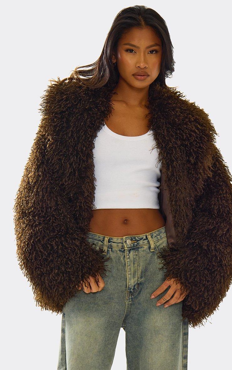 Oversized Collar Shaggy Coat In Chocolate Brown Faux Fur