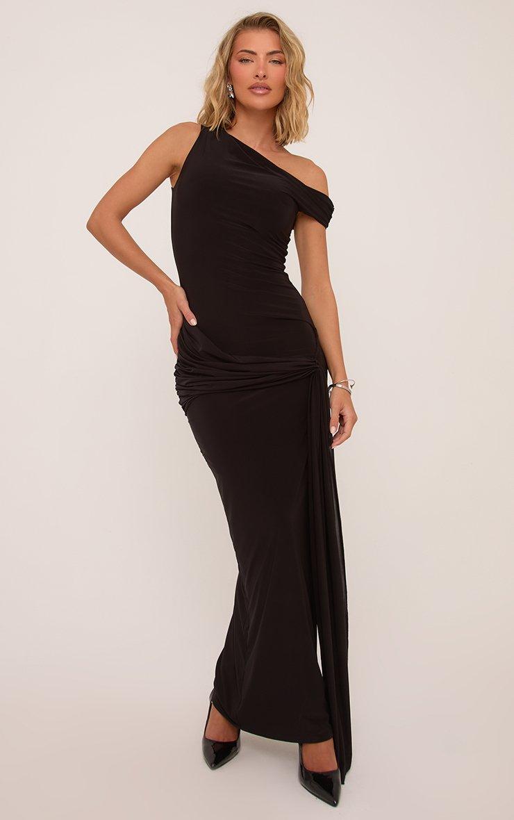 Make an unforgettable entrance in our Asymmetric One Shoulder Drape Detail Maxi Dress In Black Slinky. This black slinky maxi dress is effortlessly hot with its striking asymmetric cut, sultry one shoulder style and dramatic drape detail. Designed to make an impact, this maxi dress is ready to have all eyes on you!