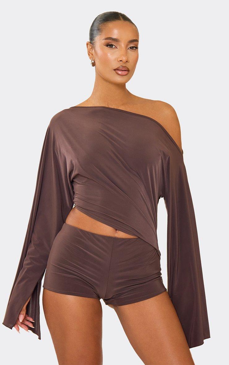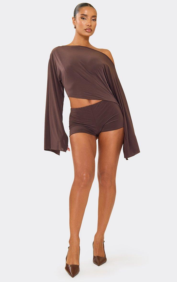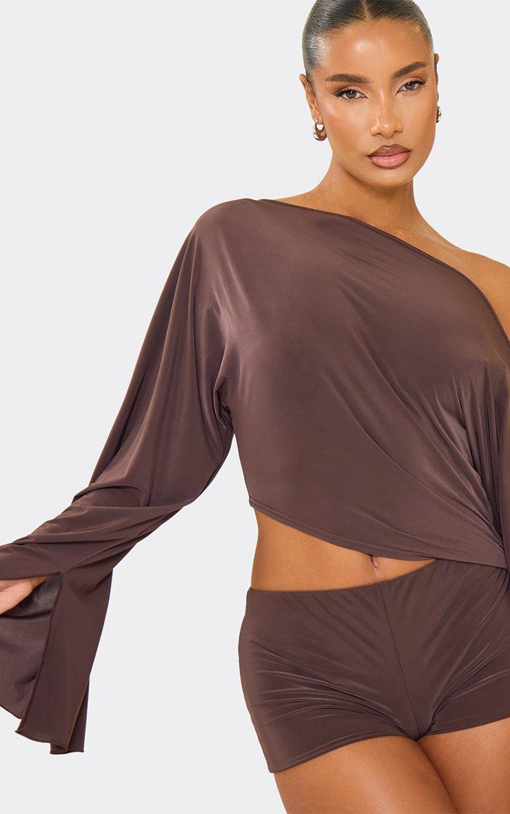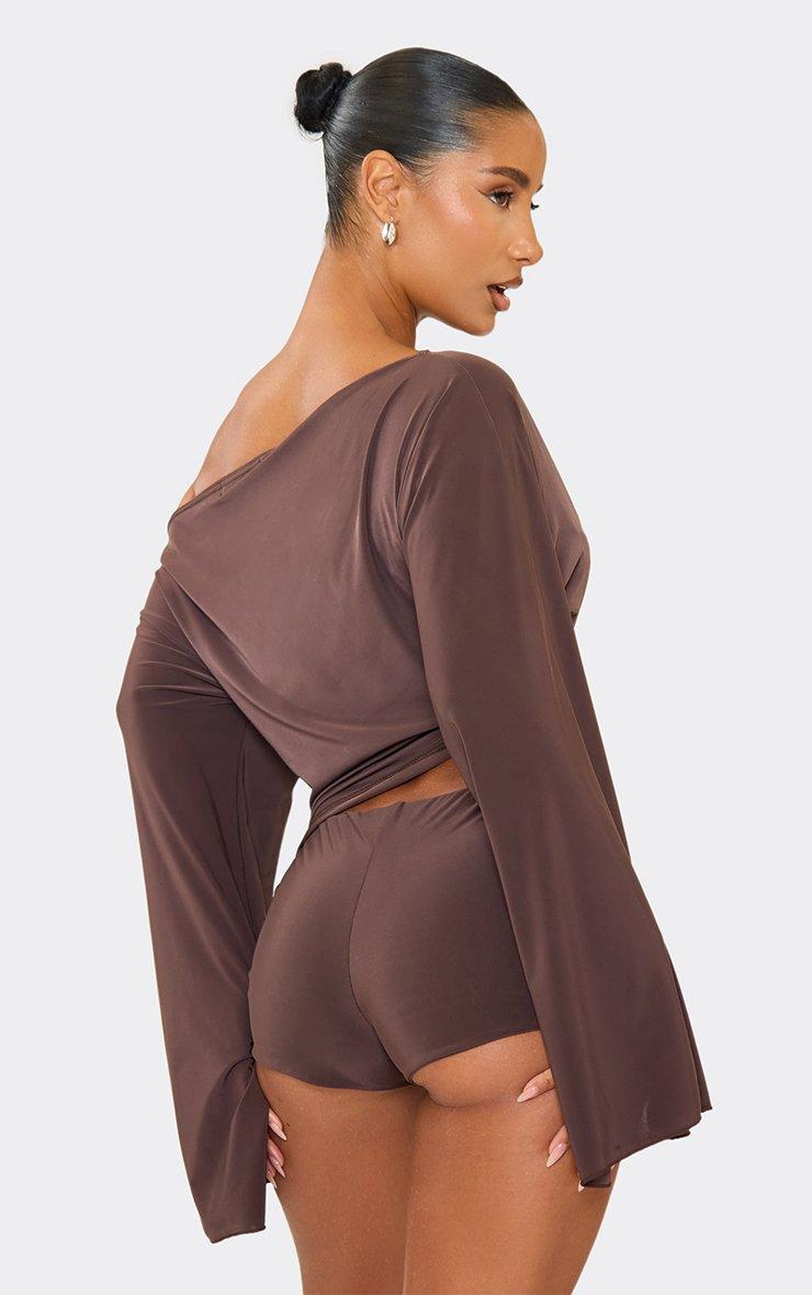 Off The Shoulder Flared Sleeve Side Cut Out Playsuit In Chocolate Brown Slinky