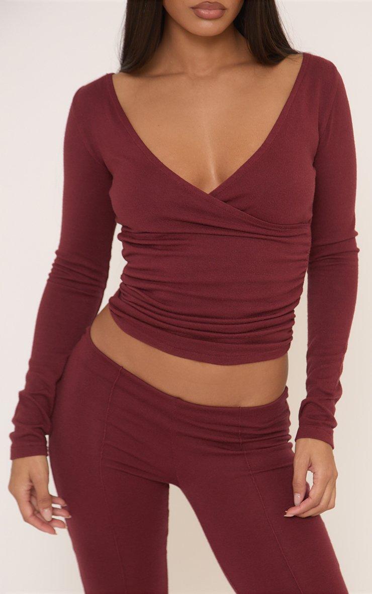Mid Rise Flared Leg Trousers In Burgundy Soft Knit
