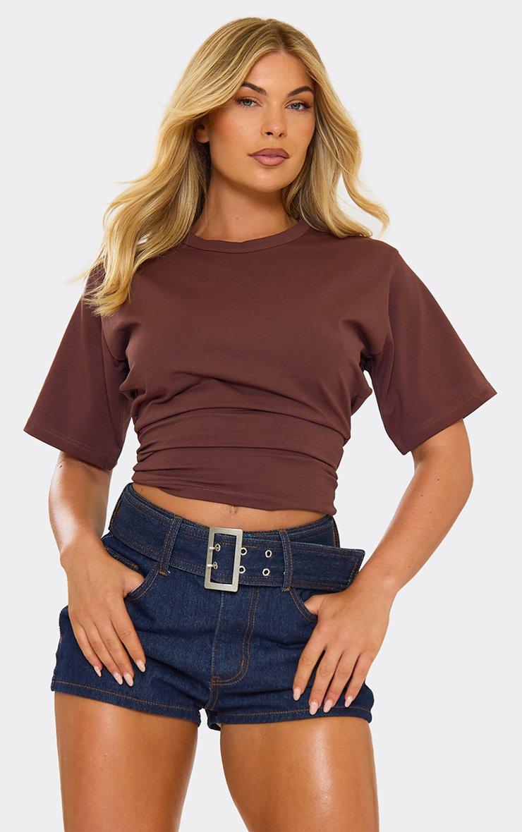 Short Sleeve Cinched Waist Fitted T-Shirt In Brown