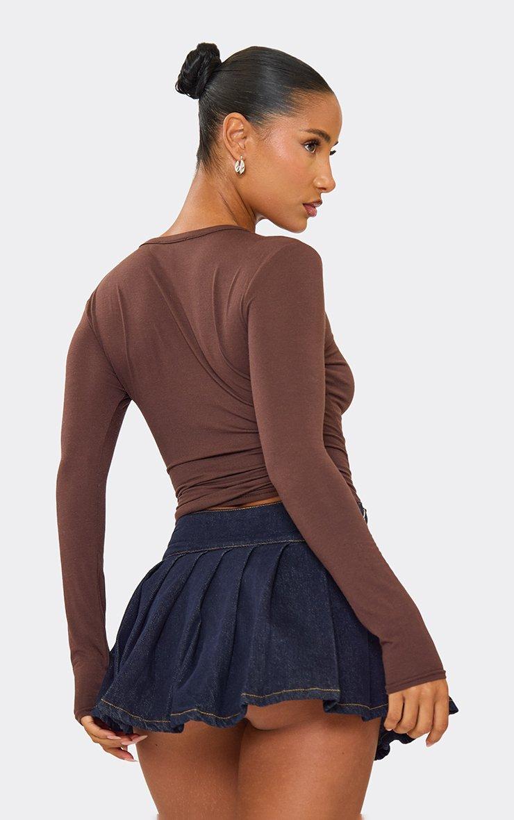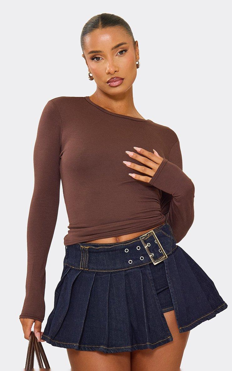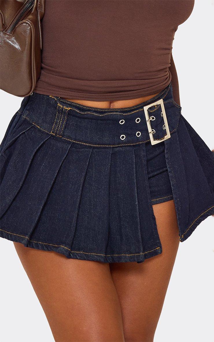 Mid Rise Chunky Belt Detail Side Split Pleated Mini Skort In Indigo Blue Denim