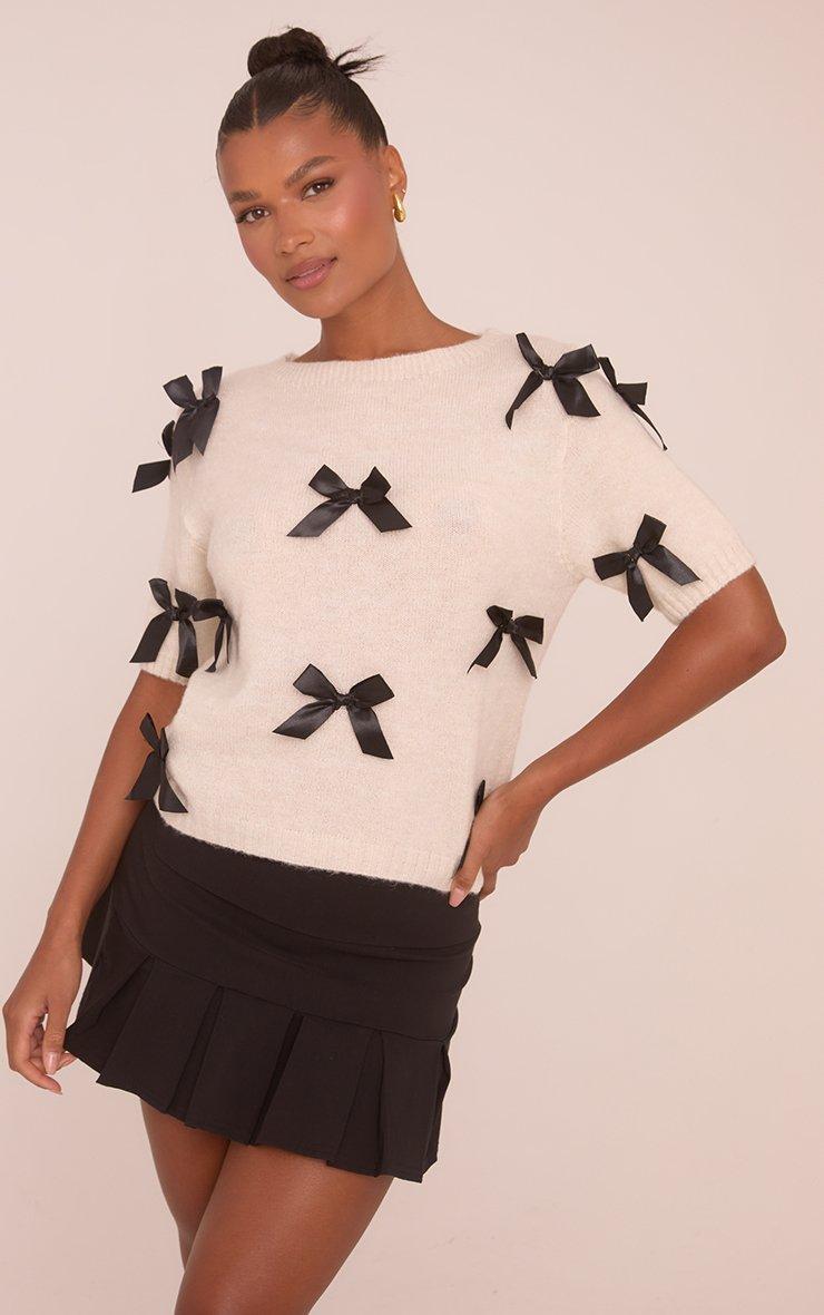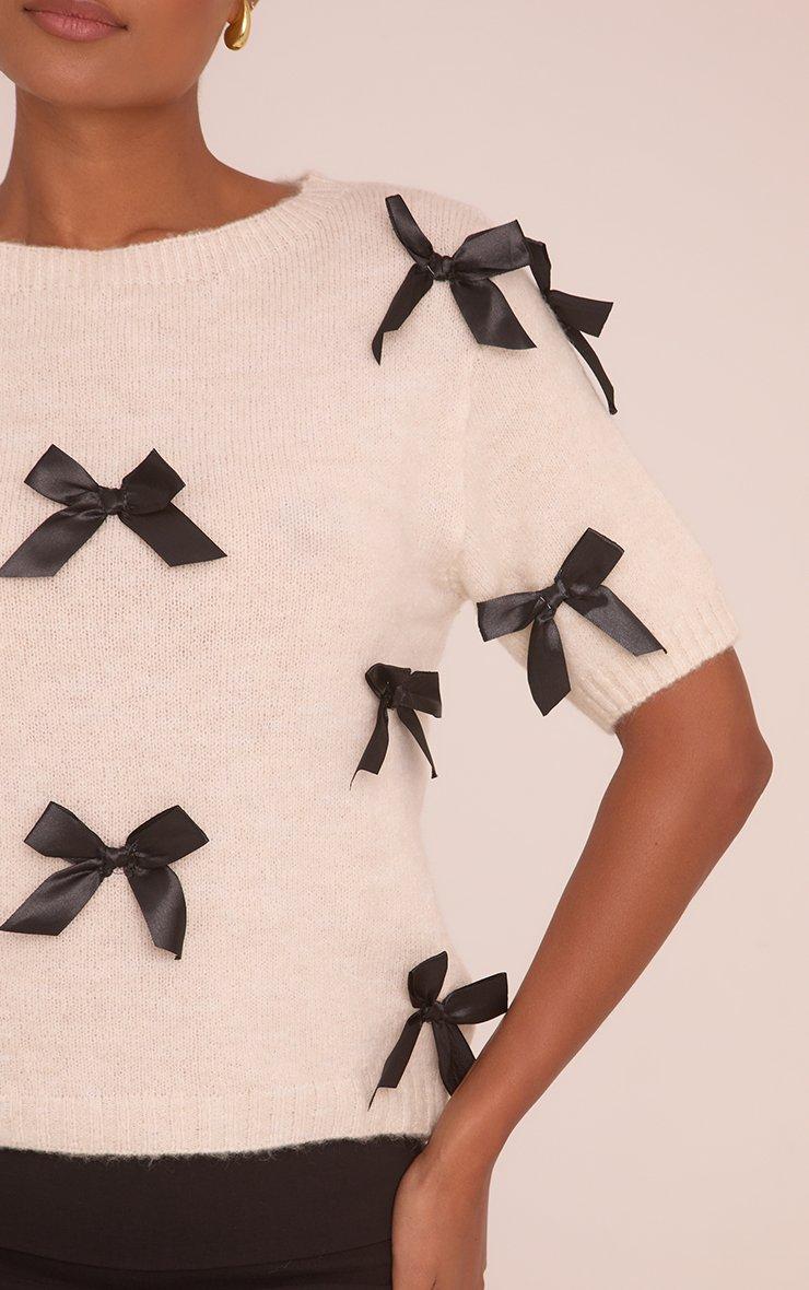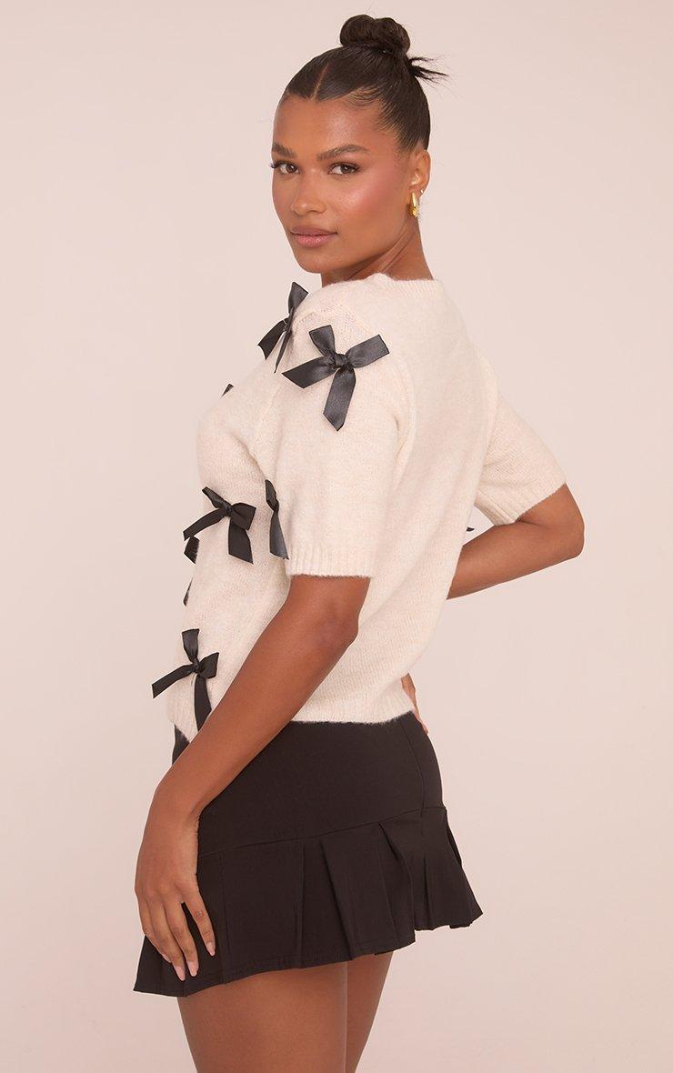 Short Sleeve Ribbon Bow Detail Jumper In Cream Knit