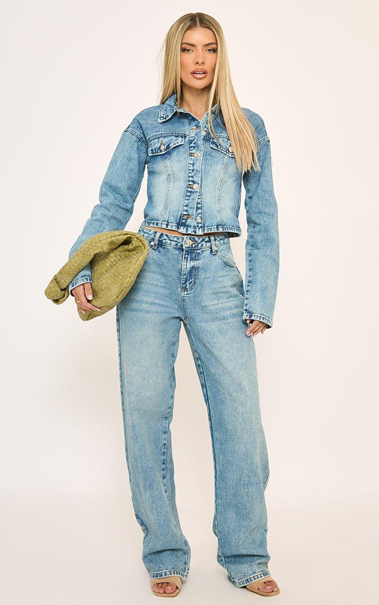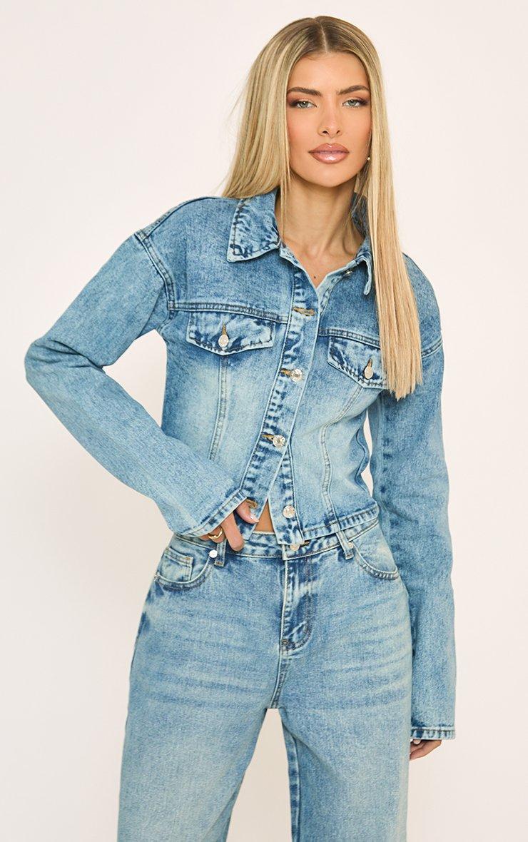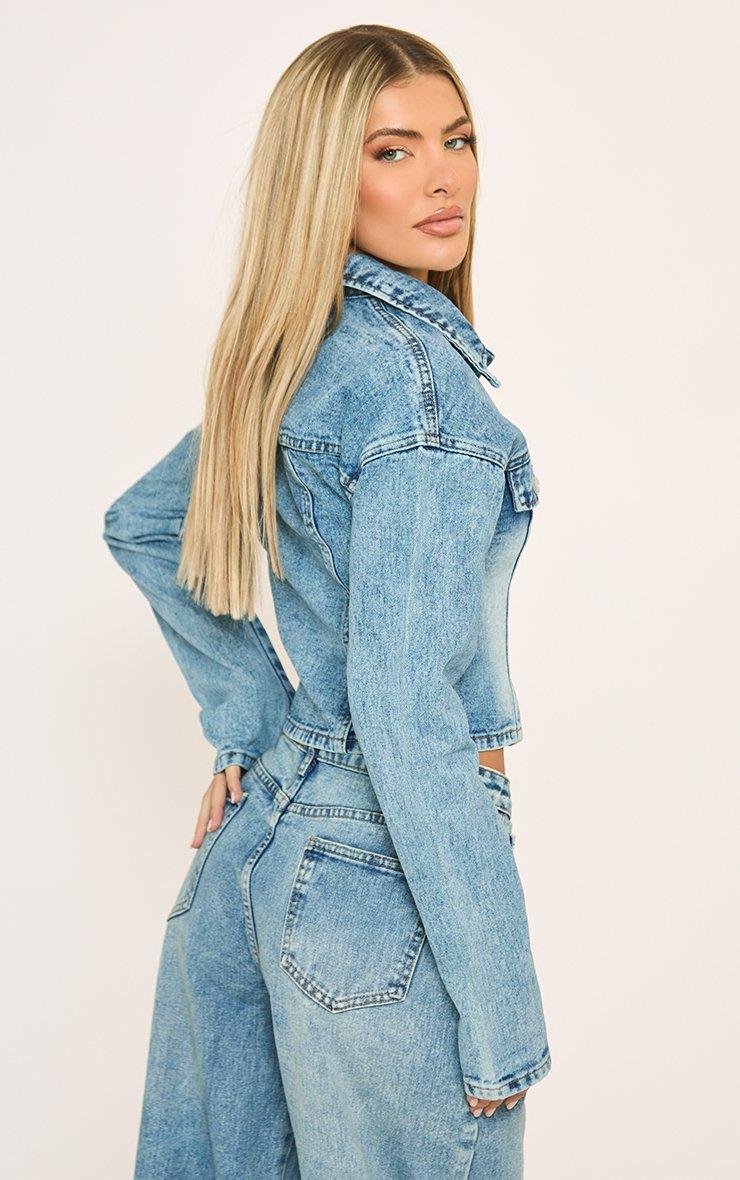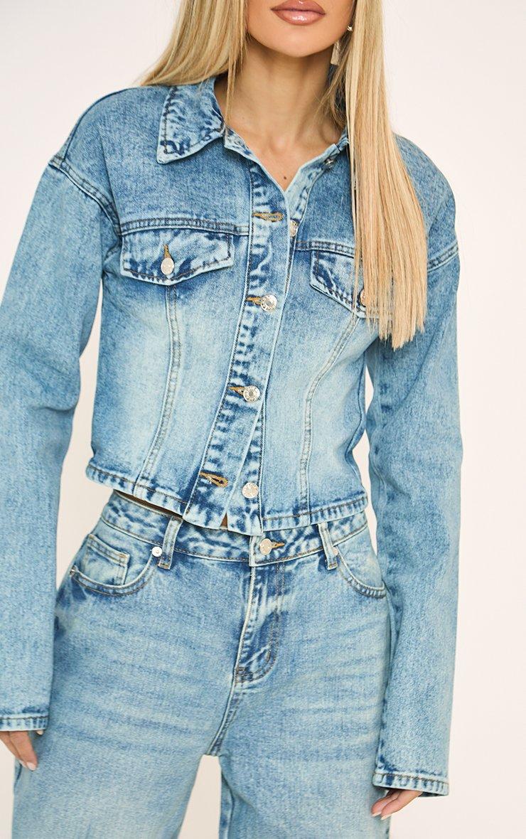 Long Sleeve Fitted Cropped Jacket In Washed Blue Denim