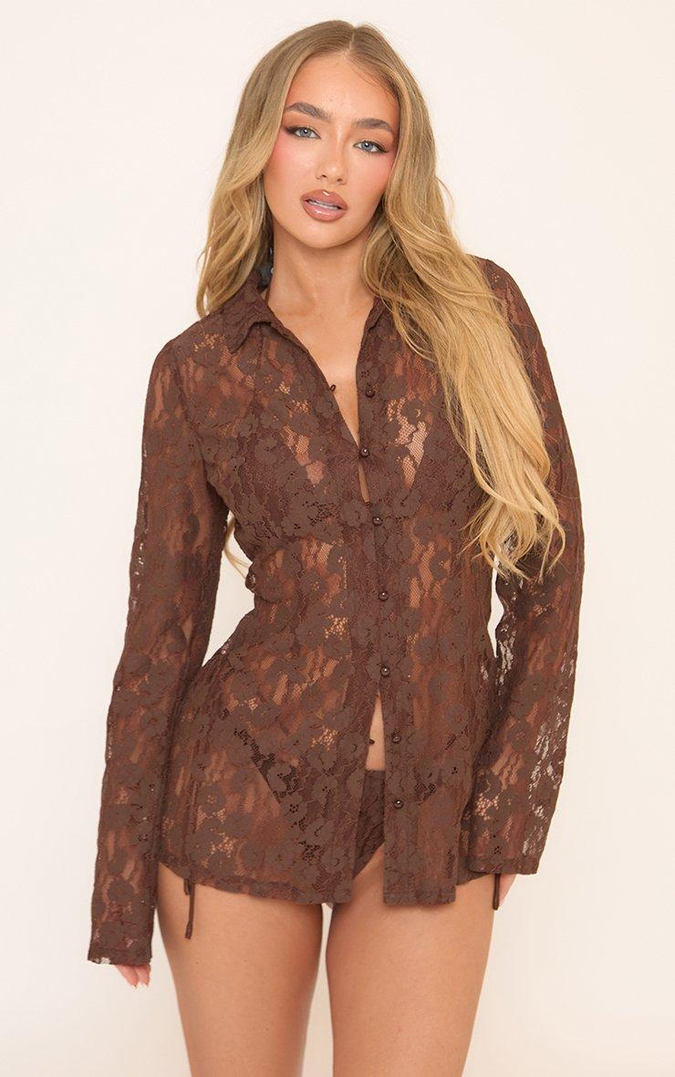 Long Sleeve Collared Button Front Cinched Waist Shirt In Brown Lace