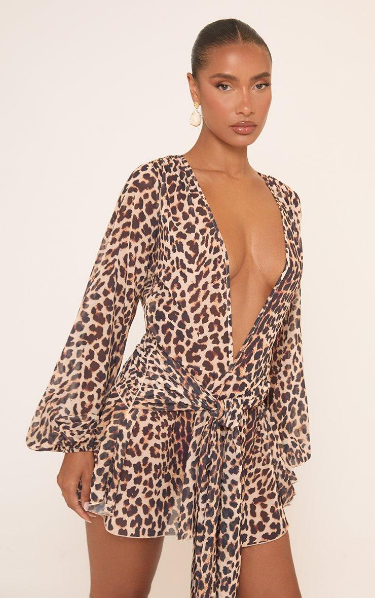 Long Sleeve Tie Front Draped Cover Up In Leopard Print