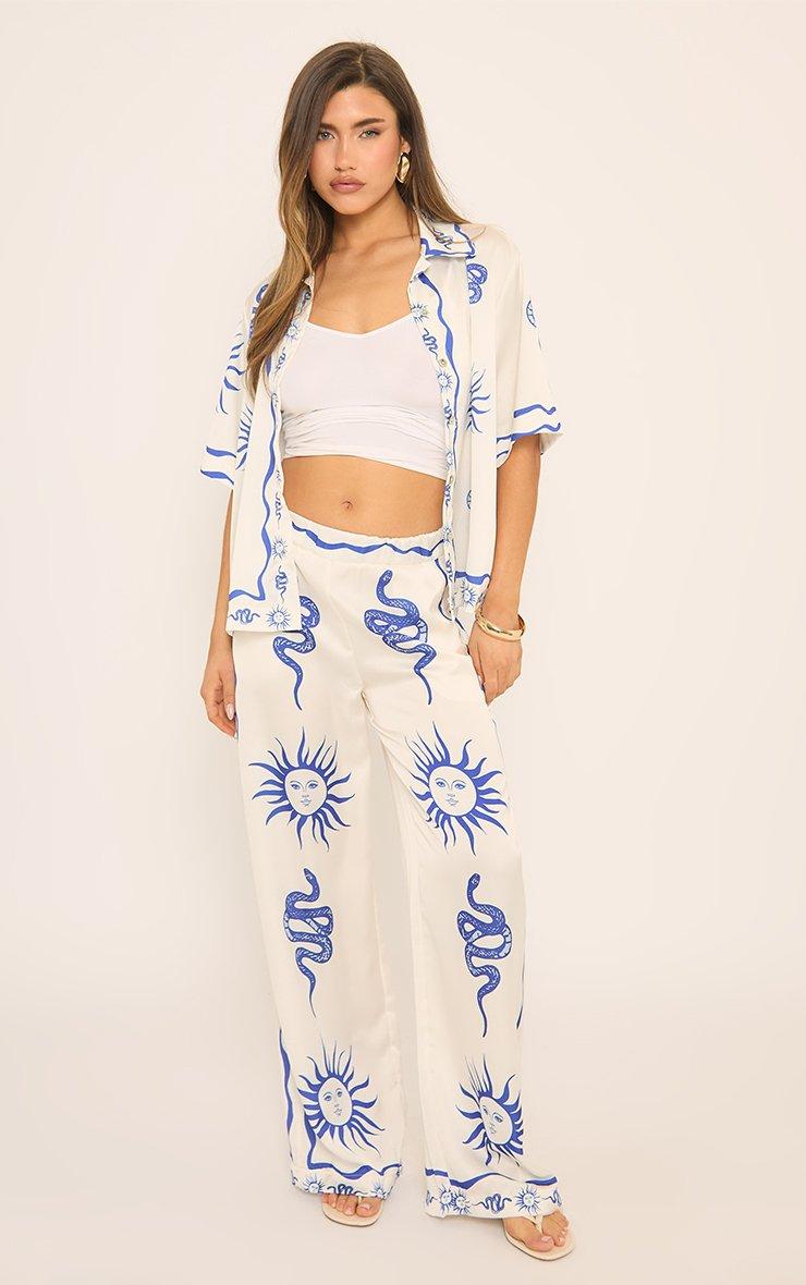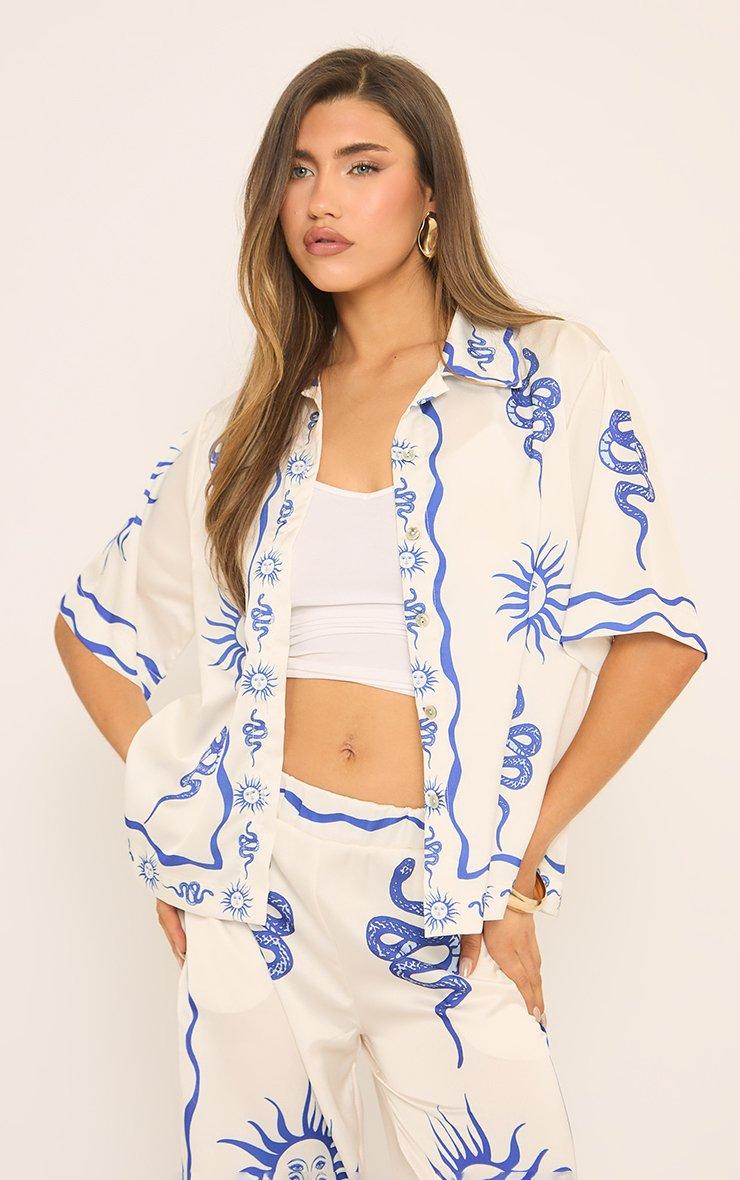 Short Sleeve Collared Detail Boxy Shirt In White Abstract Print Satin