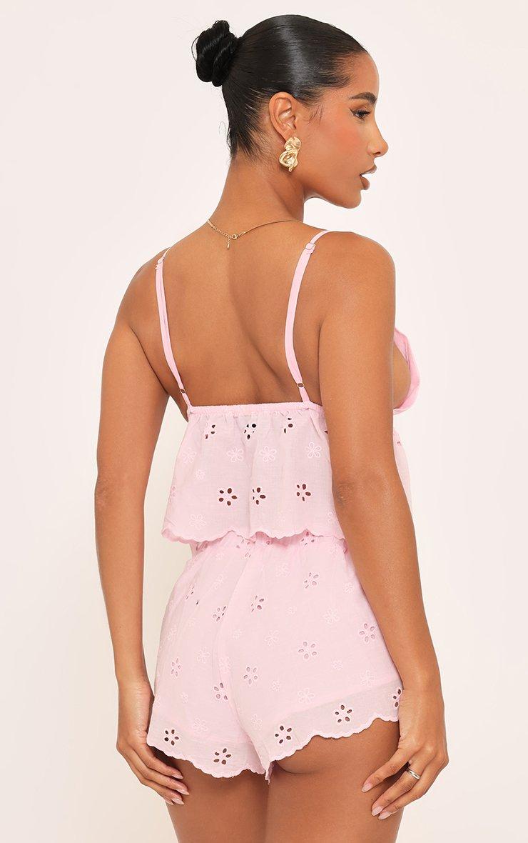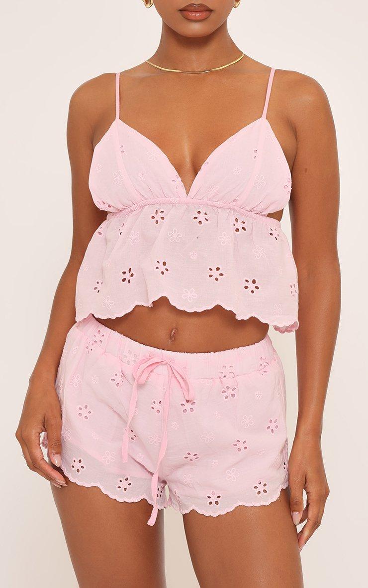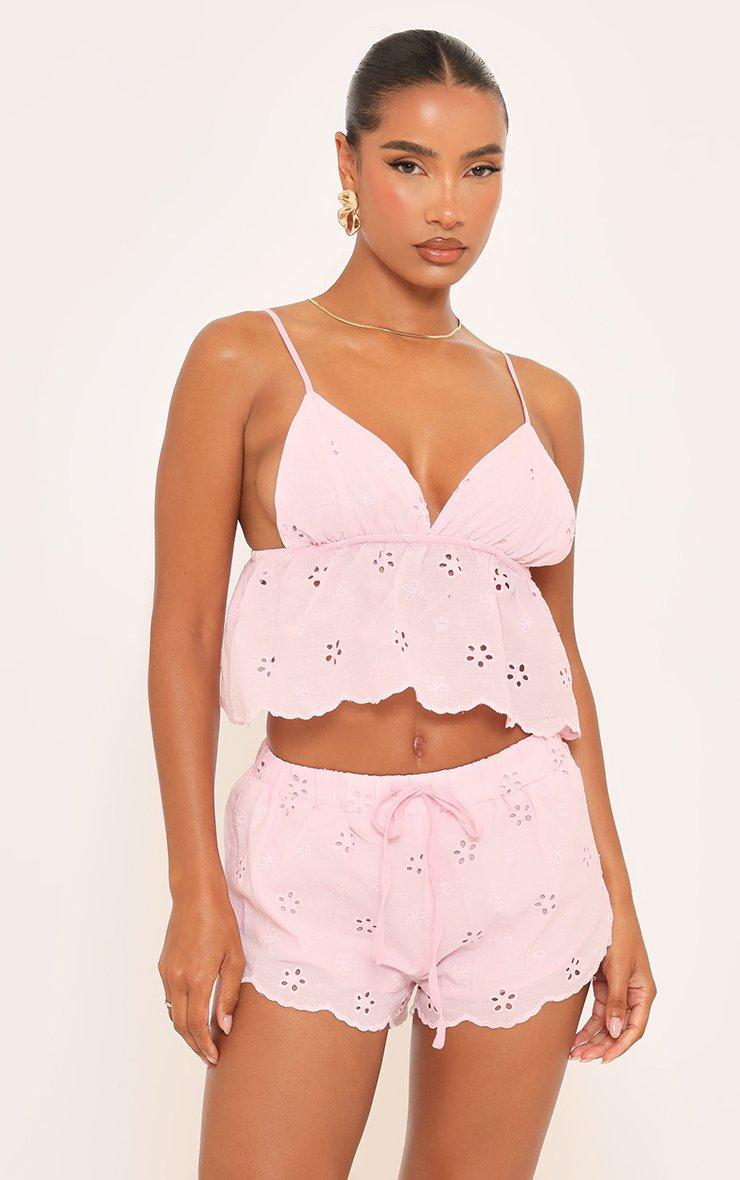 Sleeveless Floaty Crop Top And Tie Waist Detail Mini Shorts Co-Ord Set In Pink Broderie