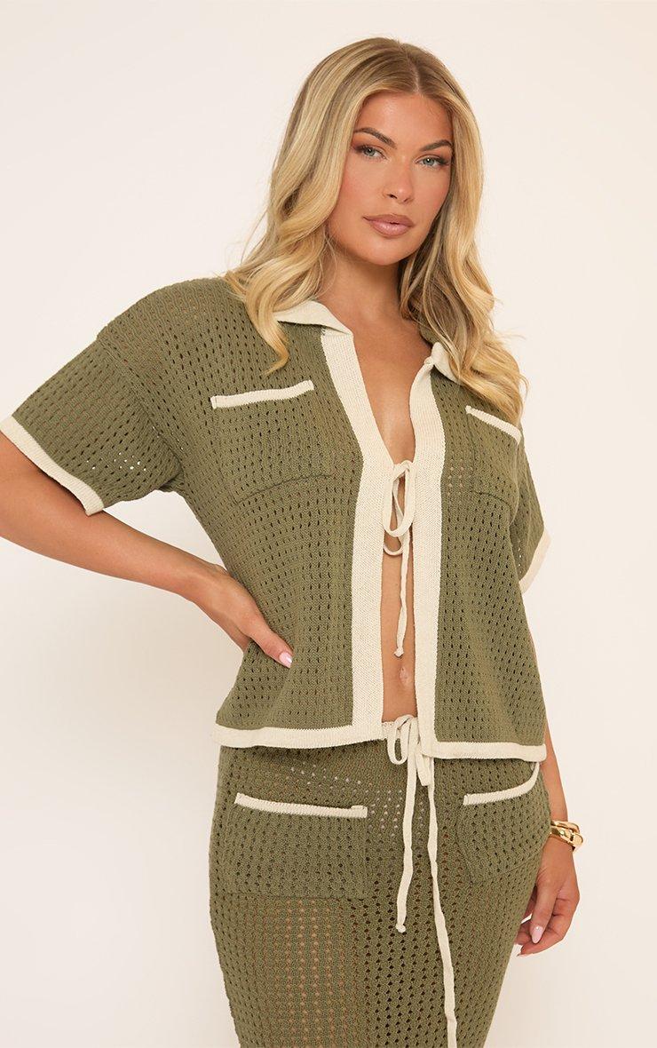 Short Sleeve Tie Front Pocket Detail Contrast Trim Shirt In Khaki Green Crochet Knit