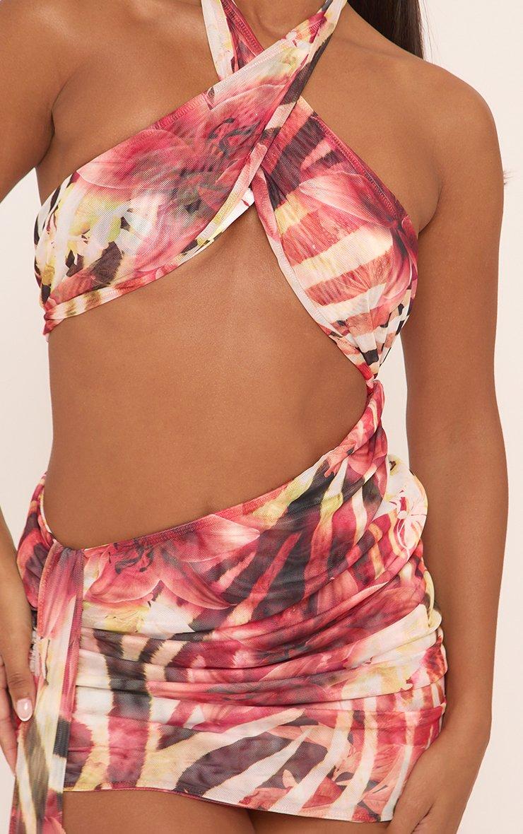 Cross Over Neck Cut Out Beach Dress In Multi Abstract Print