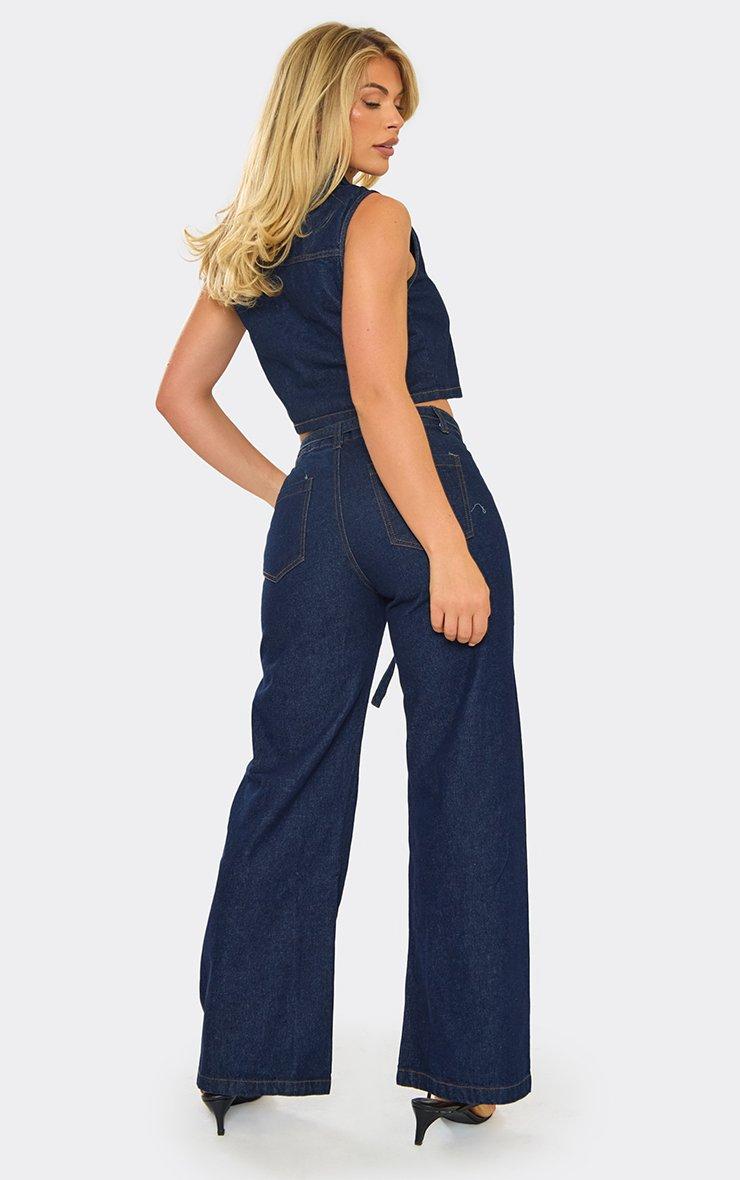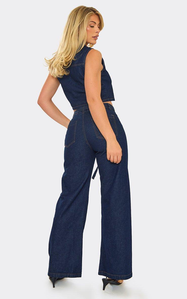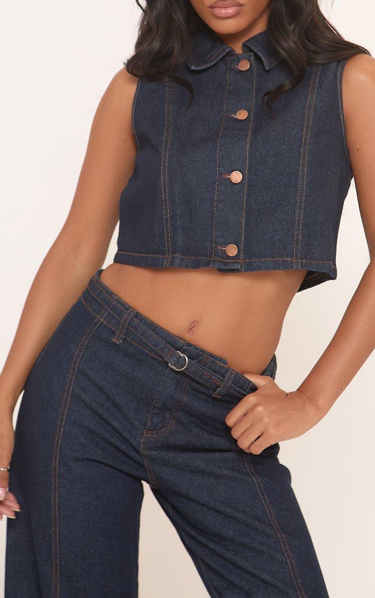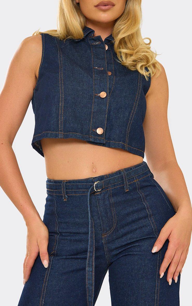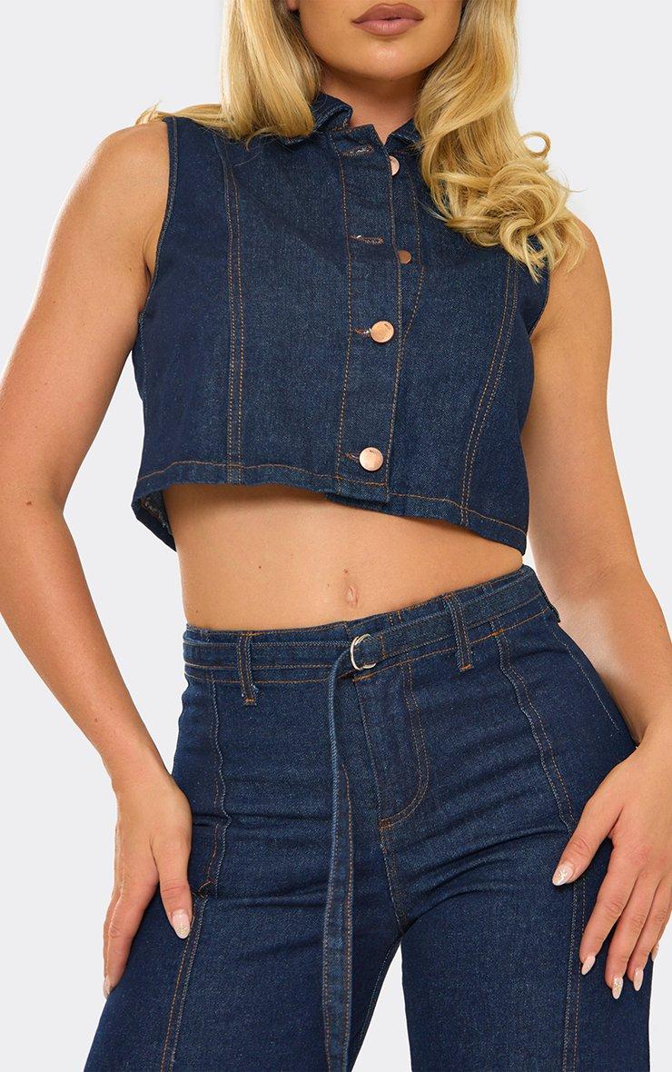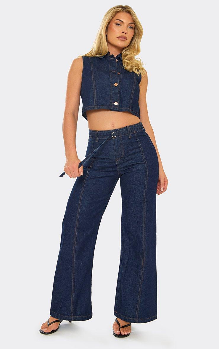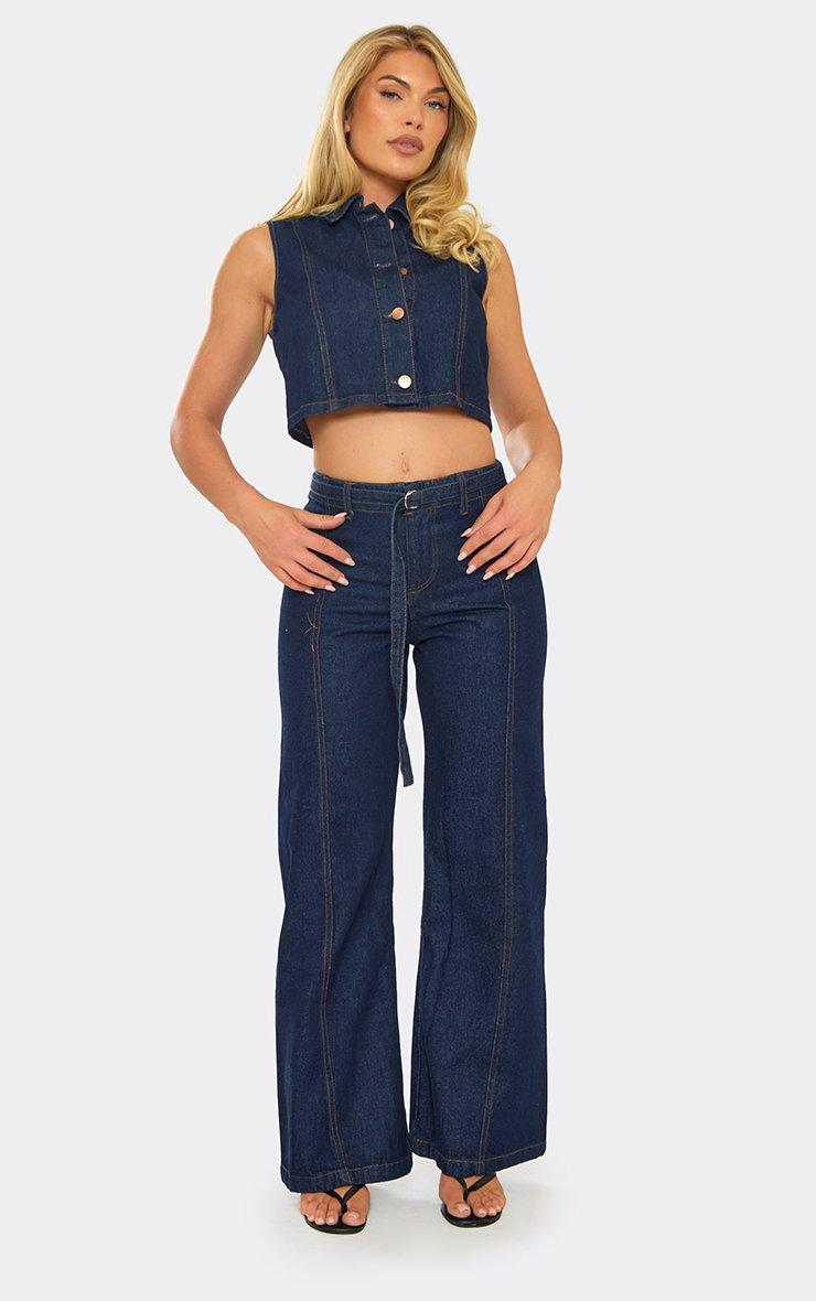 Sleeveless Collared Crop Top And Belt Detail Straight Leg Jeans Co-Ord Set In Indigo Blue Denim