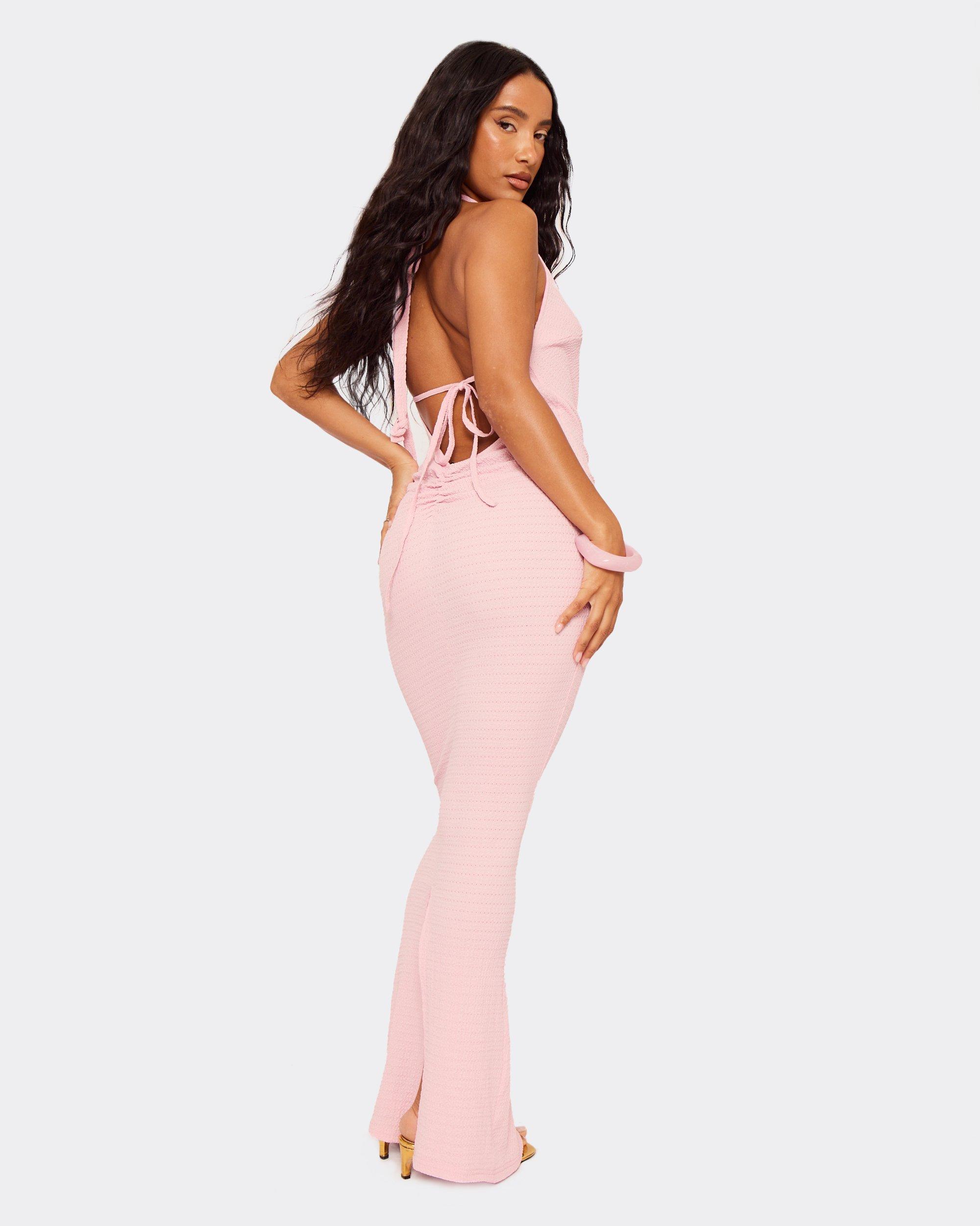 Plunge Halterneck Shell Trim Detail Open Mack Maxi Dress In Pink