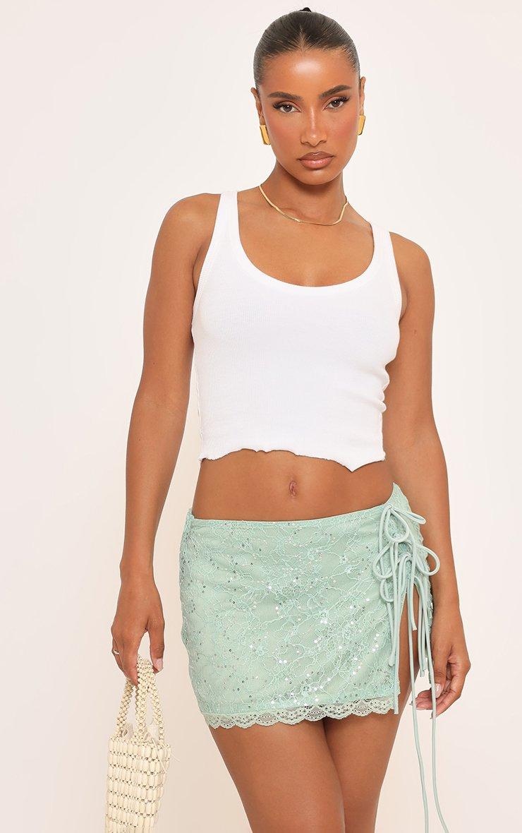 Mid Rise Tie Detail Front Split Mini Skirt In Green Sequin