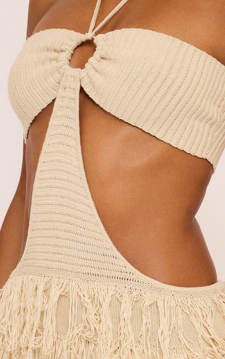 Halterneck Cut Out Ring Detail Tassel Hem Mini Dress In Stone Knit