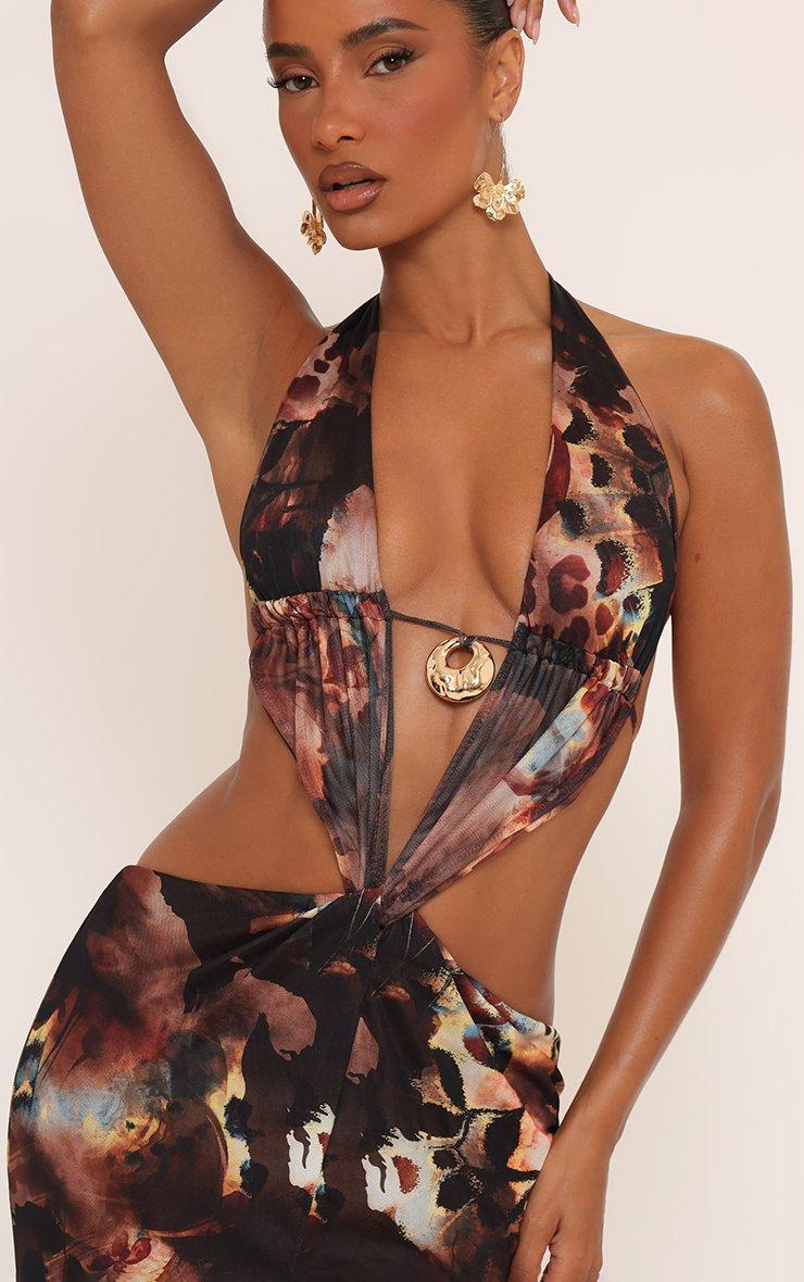Halterneck Cut Out Twisted Trim Detail Maxi Dress In Brown Abstract Print