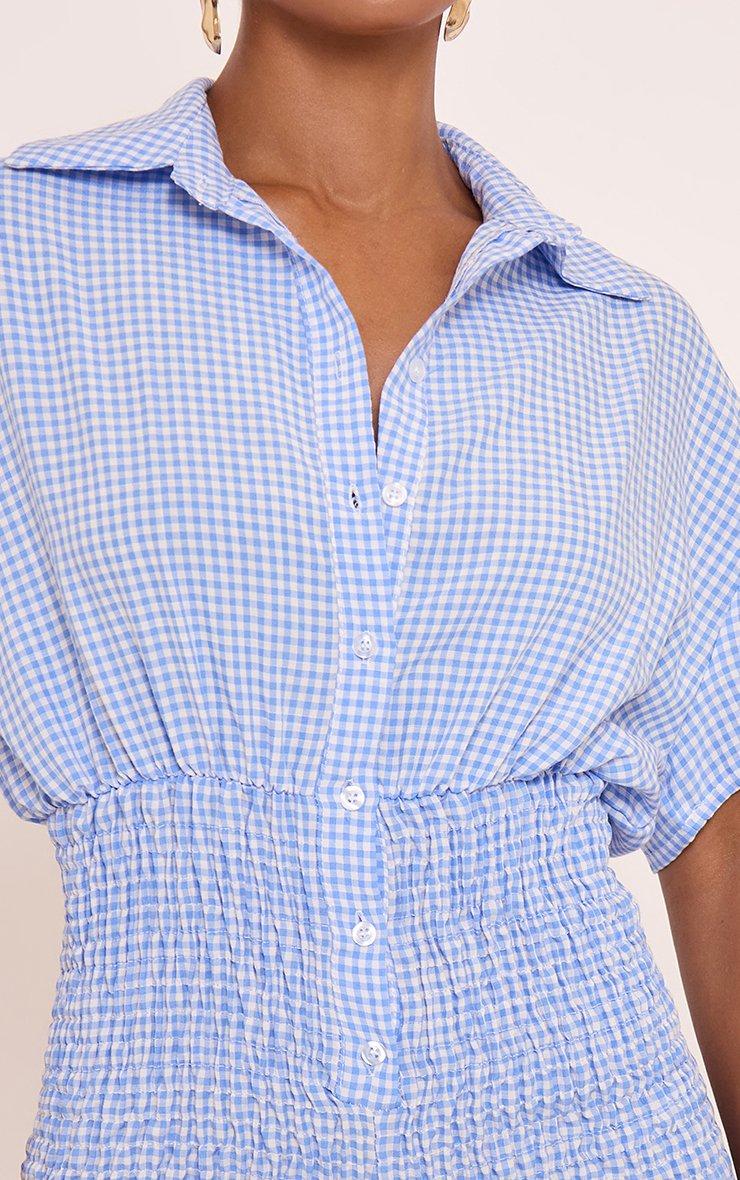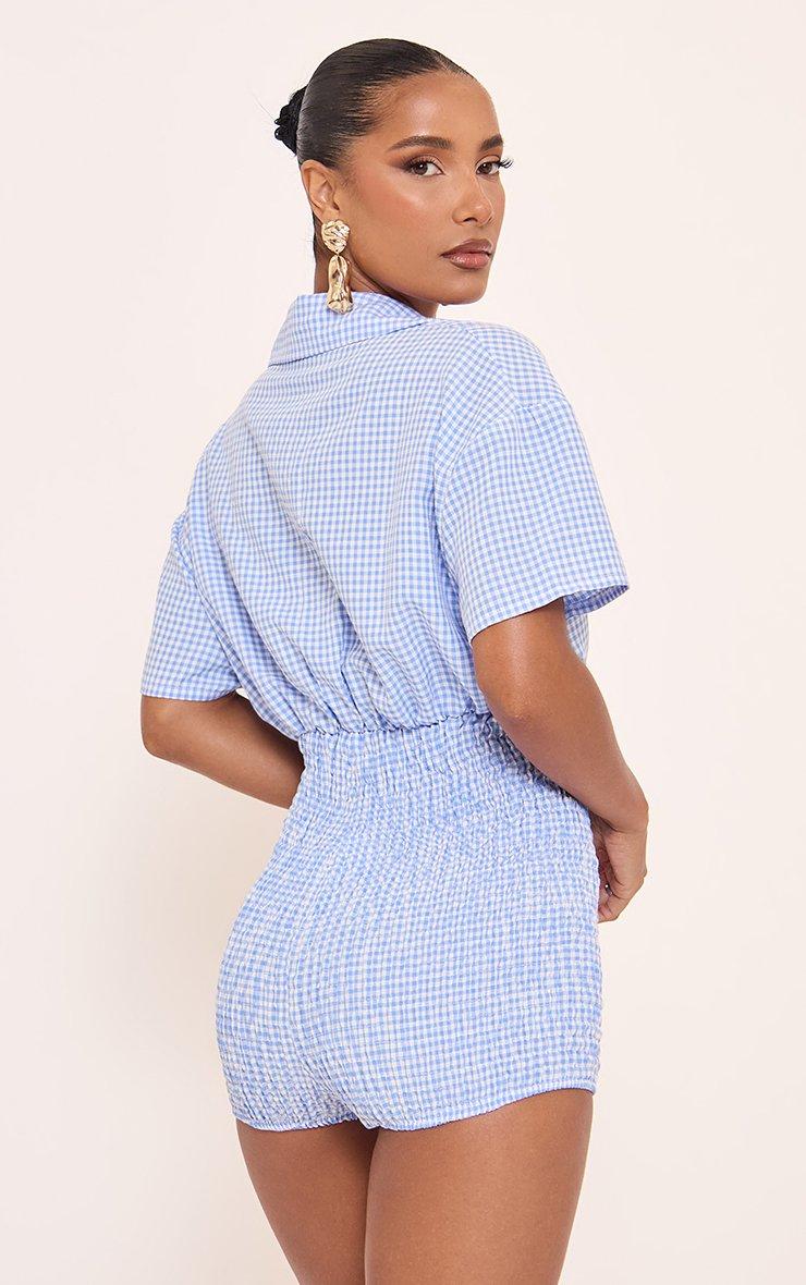 Short Sleeve Shirred Detail Playsuit In Blue Gingham
