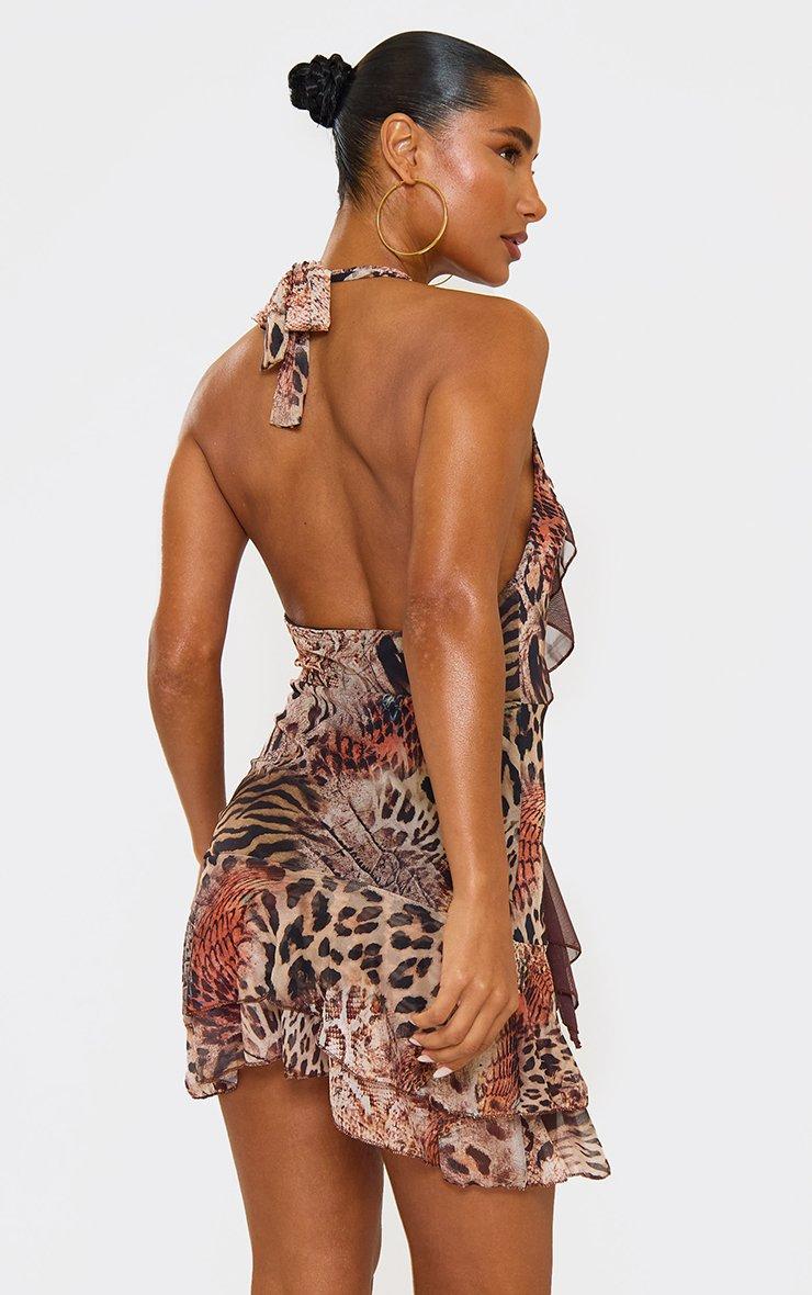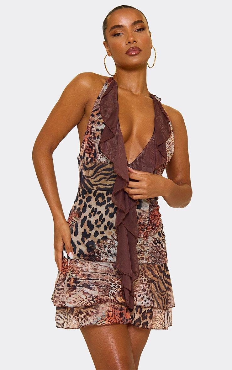 Plunge Neck Frilled Trim Mini Dress In Brown Printed