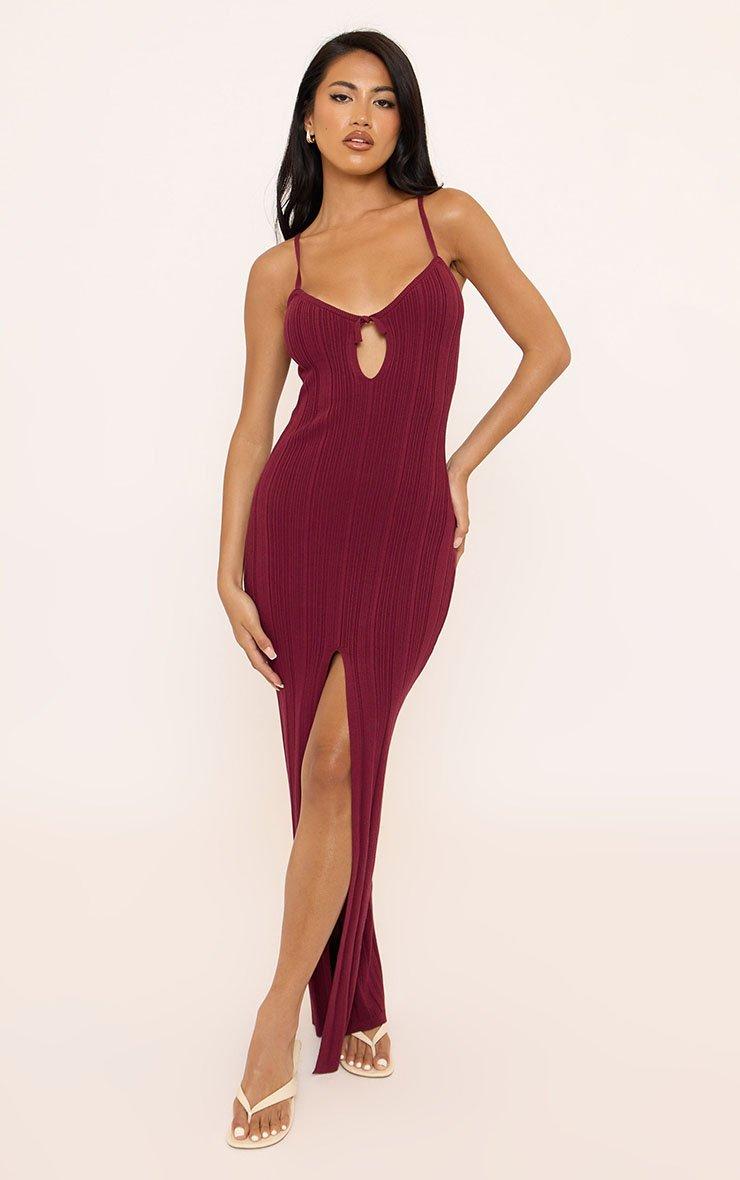 Strappy Cut Out Front Bow Detail Split Leg Maxi Dress In Burgundy Knit