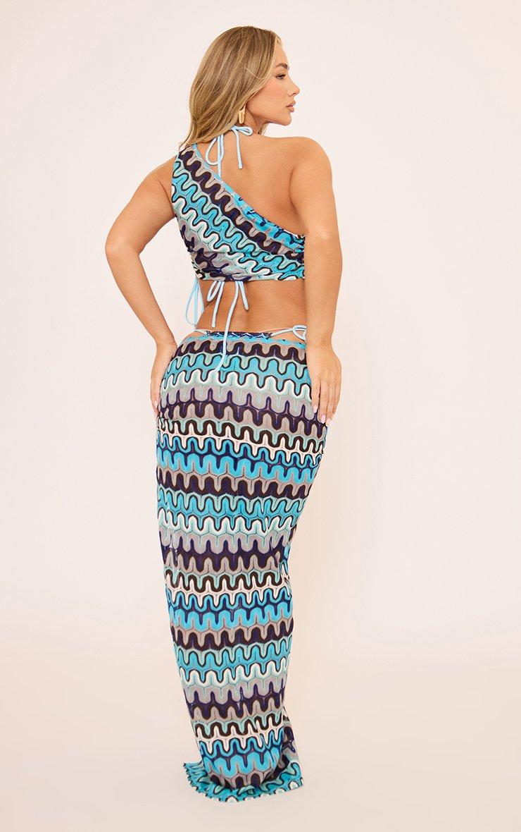 Mid Rise Ruched Open Leg Maxi Skirt In Blue Aztec Print Texture