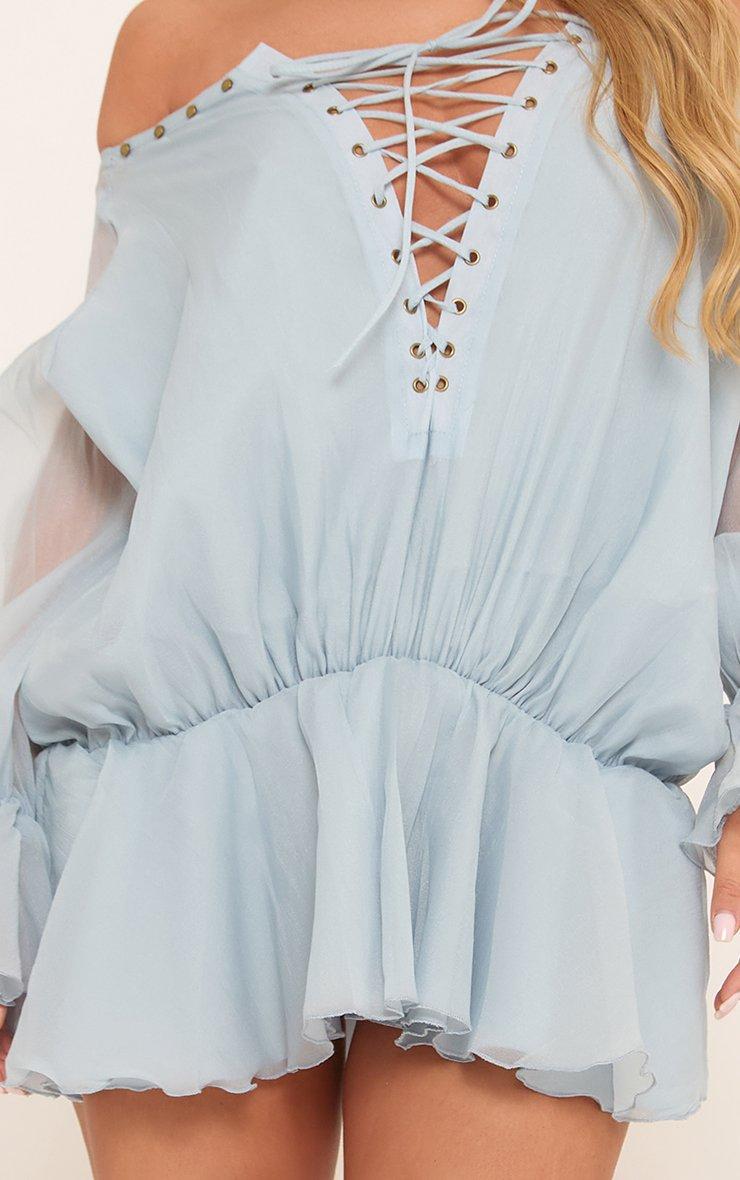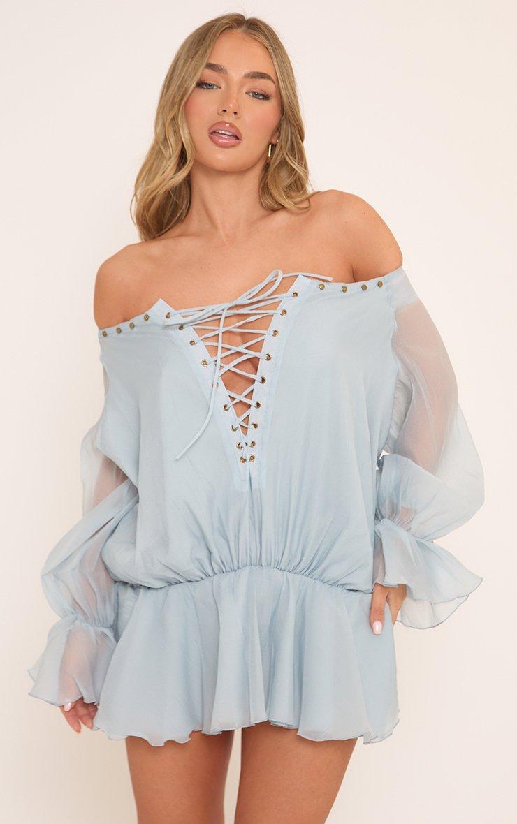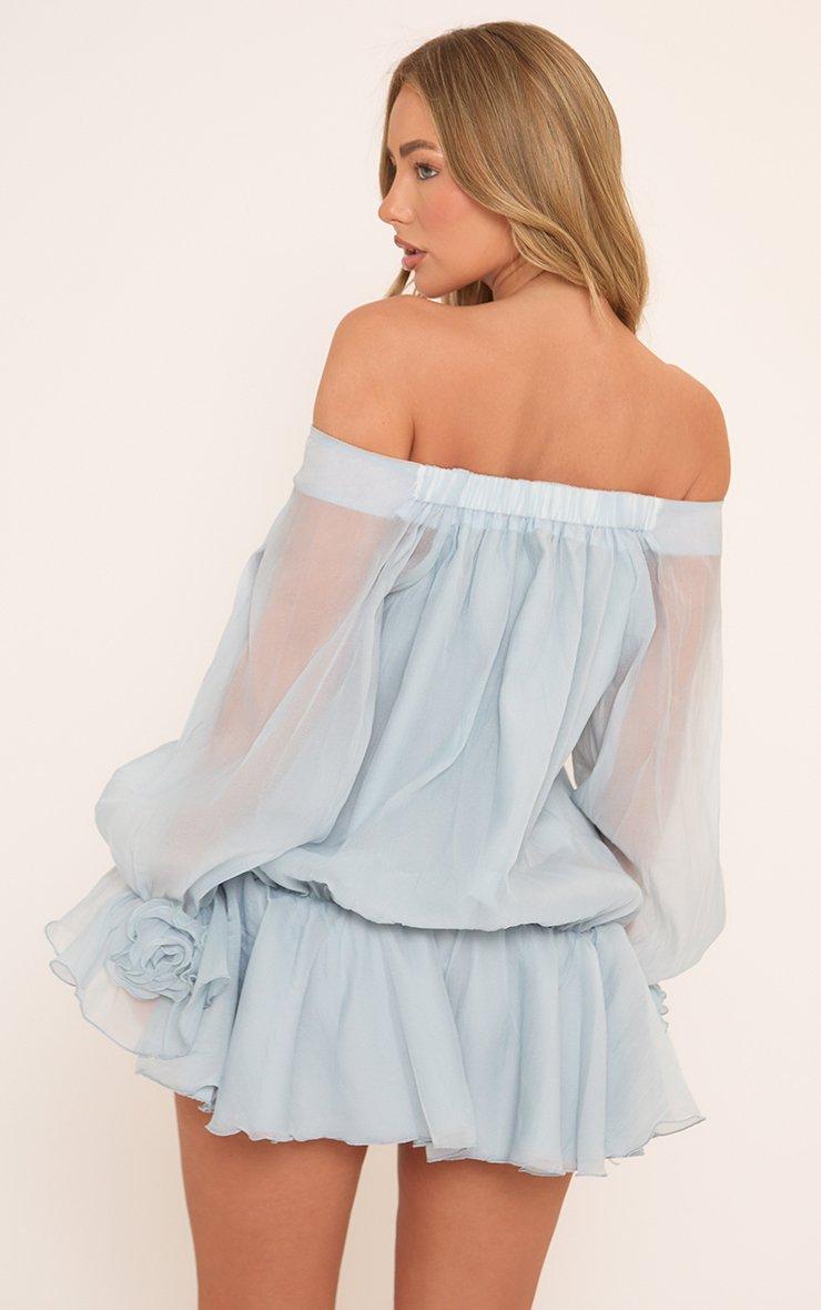 Long Mesh Sleeve Bardot Lace Up Front Flower Detail Mini Dress In Blue